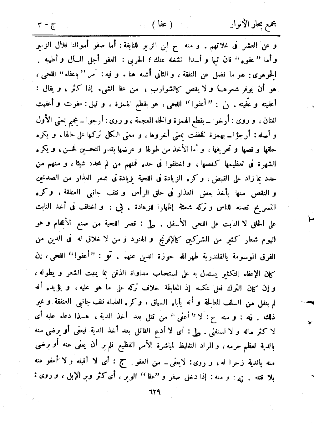 وعن العشر في غلاتهم. ومنه ح ابن الزبير للنابغة: أما صفو أموالنا فلآل الزبير وأما "عفوه" فإن تيمًا وأسدًا تشغله عنك؛ الحربي: العفو أجل المال وأطيبه. الجوهري: هو ما فضل عن النفقة، والثاني أشبه هنا. وفيه: أمر "بإعفاء" اللحي، هو أن يوفر شعرها ولا يقص كالشوارب، من عفا الشيء إذا كثر، ويقال: أعفيته وعفيته. ن: "أعفوا" اللحي، هو بقطع الهمزة، وقيل: عفوت وأعفيت لغتان، وروى: أرخوا- بقطع الهمزة والخاء المعجمة، وروى: أرجوا- بجيم بمعنى الأول وأصله: أرجؤ- بهمزة فخففت بمعنى أخروها، ومعنى الكل تركها على حالها، ويكره حلقها وقصها وتحريفها، وأما الأخذ من طولها وعرضها بقدر التحسين فحسن، ويكره الشهرة في تعظيمها كقصها، واختلفوا في حده فمنهم من لم يحدد شيئًا، ومنهم من حدد بما زاد على القبض، وكره الزيادة في اللحية بزيادة في شعر العذار من الصدغين والنقص منها بأخذ بعض العذار في حلق الرأس ونتف جانبي العنفقة، وكره التسريح تصنعًا للناس وتركه شعثة إظهارًا للزهادة. بي: واختلف في أخذ النابت على الحلق لا النابت على اللحي الأسفل. ط: قصر اللحية من صنع الأعجام وهو اليوم شعار كثير من المشركين كالإفرنج والهنود ومن لا خلاق له في الدين من الفرق الموسومة بالقلندرية طهر الله حوزة الدين عنهم. تو: "أعفوا" اللحي، إن كان الإعفاء التكثير يستدل به على استحباب مداواة الذقن بما ينبت الشعر ويطوله، وإن كان الترك فعلى عكسه إذ المعالجة خلاف تركه على ما هو عليه، ويؤيده أنه لم ينقل من السلف المعالجة وأنه يأباه السياق، وكره العلماء نتف جانبي العنفقة وغير ذلك. نه: ومنه ح: لا "أعفي" من قتل بعد أخذ الدية، هذا دعاء عليه أي لا كثر ماله ولا استغنى. ط: أي لا أدع القاتل بعد أخذ الدية فيعفى أو يرضى منه بالدية لعظم جرمه، والمراد التغليظ لمباشرة الأمر الفظيع فلم ير أن يعفى عنه أو يرضى منه بالدية زجرًا لهن وروى: لا يعفى- من العفو. ج: أي لا أقبله ولا أعفو عنه بلا قتله. نه: ومنه: إذا دخل صفر و"عفا" الوبر، أي كثر وبر الإبل، وروى: