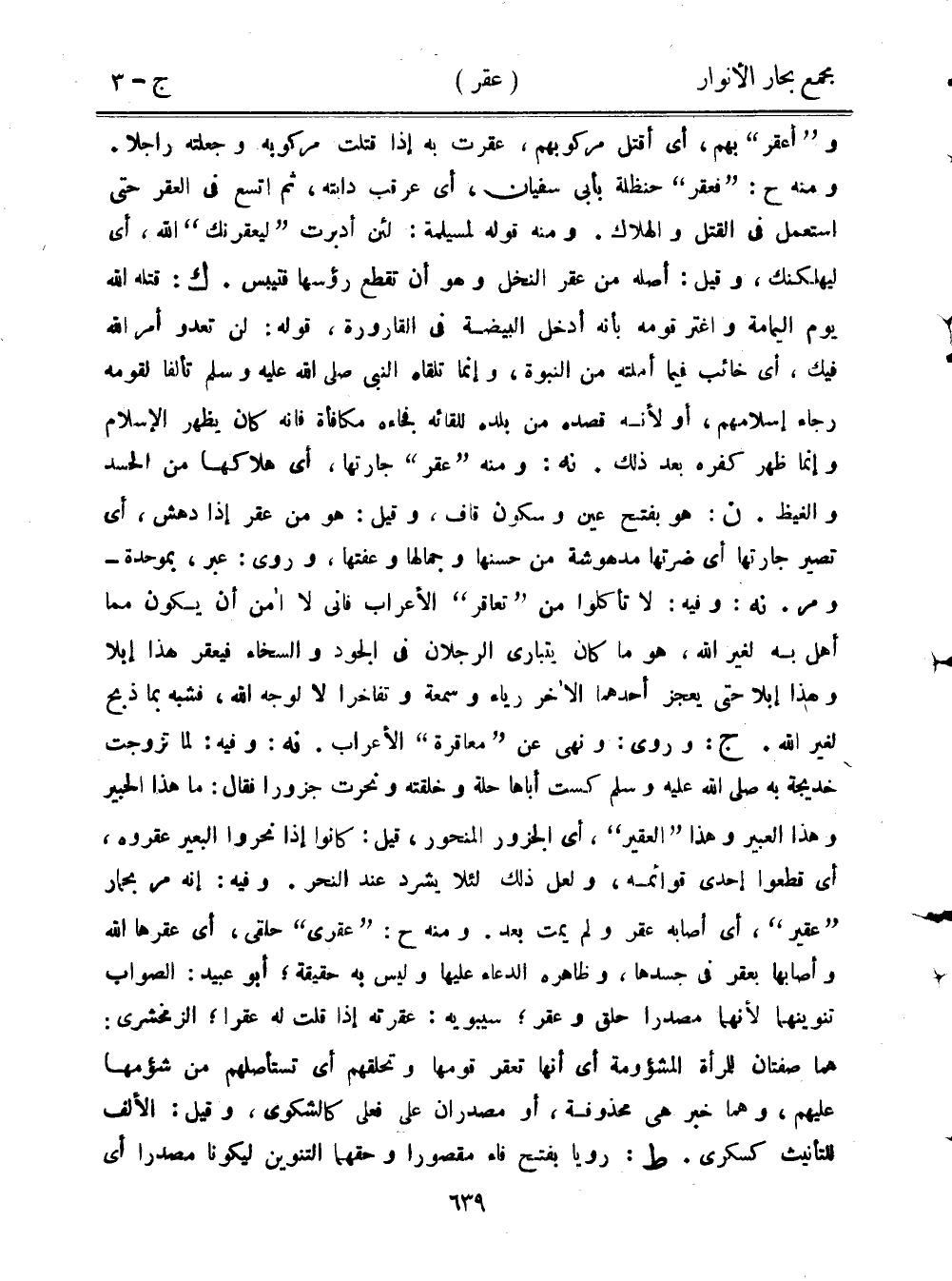 و"أعقر" بهم، أي أقتل مركوبهم، عقرت به إذا قتلت مركوبه وجعلته راجلًا. ومنه ح: "فعقر" حنظلة بأبي سفيان، أي عرقب دابته، ثم اتسع في العقر حتى استعمل في القتل والهلاك. ومنه قوله لمسيلمة: لئن أدبرت "ليعقرنك" الله، أي ليهلكنك، وقيل: أصله من عقر النخل وهو أن تقطع رؤسها فتيبس. ك: قتله الله يوم اليمامة واغتر قومه بأنه أدخل البيضة في القارورة، قوله: لن تعدو أمر الله فيك، أي خائب فيما أملته من النبوة، وإنما تلقاه النبي صلى الله عليه وسلم تألفًا لقومه رجاء إسلامهم، أو لأنه قصده من بلده للقائه فجاءه مكافأة فإنه كان يظهر الإسلام وإنما ظهر كفره بعد ذلك. نه: ومنه "عقر" جارتها، أي هلاكها من الحسد والغيظ. ن: هو بفتح عين وسكون قاف، وقيل: هو من عقر إذا دهش، أي تصير جارتها أي ضرتها مدهوشة من حسنها وجمالها وعفتها، وروى: عبر، بموحدة- ومر. نه: وفيه: لا تأكلوا من "تعاقر" الأعراب فإني لا آمن أن يكون مما أهل به لغير الله، هو ما كان يتبارى الرجلان في الجود والسخاء فيعقر هذا إبلًا وهذا إبلًا حتى يعجز أحدهما الآخر رياء وسمعة وتفاخرًا لا لوجه الله، فشبه بما ذبح لغير الله. ج: وروى: ونهى عن "معاقرة" الأعراب. نه: وفيه: لما تزوجت خديجة به صلى الله عليه وسلم كست أباها حلة وخلقته ونحرت جزورًا فقال: ما هذا الحبير وهذا العبير وهذا "العقير"، أي الجزور المنحور، قيل: كانوا إذا نحروا البعير عقروه، أي قطعوا إحدى قوائمه، ولعل ذلك لئلا يشرد عند النحر. وفيه: إنه مر بحمار "عقير"، أي أصابه عقر ولم يمت بعد. ومنه ح: "عقرى" حلقى، أي عقرها الله وأصابها بعقر في جسدها، وظاهره الدعاء عليها وليس به حقيقة؛ أبو عبيد: الصواب تنوينهما لأنهما مصدرًا حلق وعقر؛ سيبويه: عقرته إذا قلت له عقرًا؛ الزمخشري: هما صفتان للمرأة المشؤومة أي أنها تعقر قومها وتحلقهم أي تستأصلهم من شؤمها عليهم، وهما خبر هي محذوفة، أو مصدران على فعلي كالشكوى، وقيل: الألف للتأنيث كسكري. ط: رويا بفتح فاء مقصورًا وحقهما التنوين ليكونا مصدرًا أي