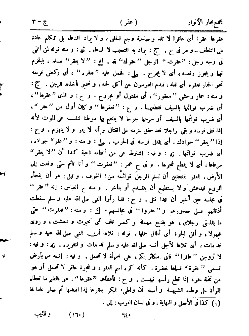 عقرها عقرًا أي عاقرًا لا تلد وصاحبة وجع الحلق، ولا يراد الدعاء بل تكلم عادة على التلطف- ومر في ح. ج: يراد به التعجب لا الدعاء. نه: ومنه قوله لمن أثنى في وجه رجل: "عقرت" الرجل "عقرك" الله. ك: "لا يعقر" مسلمًا، بالجزم نهما ويجوز رفعه، أي لا يجرح. ط: فحمل عليه "فعقره"، أي ركض فرسه نحو الحمار فعقره أي قتله، فندم المحرمون عن أكل لحمه، وضمير فأخذها للرجل. ج: ومنه: حمار وحشي "معقور"، أي مقتول أو مجروح. وح: والذي "عقرها"، أي ضرب قوائمها بالسيف فقطعها. وح: "فعقرها" وكان أول من "عقر"، أي ضرب قوائمها بالسيف فقطعها. وح: "فعقرها" وكان أول من "عقر"، أي ضرب قوائمها بالسيف أو جرحها جرحًا لا ينتفع بها موطنًا لنفسه على الموت لأنه إذا قتل فرسه وبقي راجلًا فقد حقق عزمه على القتال وأنه لا يفر ولا ينهزم. وح: إذا "يعقر" جوادك، أي يقتل فرسه في الحرب. ط: ومنه: و"عقر" جواده، أي ضرب قوائمها. نه: وفيه: اشترط على من أقطعه ناحية كذا أن "لا يعقر" مرعاها، أي لا يقطع شجرها. وفي ح عمر: "فعقرت" وأنا قائم حتى وقعت إلى الأرض، العقر بفتحتين أن تسلم الرجل قوائمه من الخوف، وقيل: هو أن يفجأه الروع فيدهش ولا يستطيع أن يتقدم أو يتأخر. ومنه ح العباس: إنه "عقر" في مجلسه حين أخبر أن محمدًا قتل. وح: فلما رأوا النبي صلى الله عليه وسلم سقطت أذقانهم على صدورهم و"عقروا" في مجالسهم. ك: ومنه: "فعقرت" حتى ما يقلني رجلاي، هو بفتح مهملة وكسر قاف أي تحيرت ودهشت، وروى مجهولًا، وأقل الجرة أي أطاق حملها، قوله: تلاها أن النبي صلى الله عليه وسلم قد مات، أي تلاها لأجل أنه صلى الله عليه وسلم قد مات ولتقريره. نه: وفيه: لا تزوجن "عاقرًا" فإني مكاثر بكم، هي امرأة لا تحمل. وفيه: إنه مر بأرض تسمى "عقرة" فسماها خضرة، كأنه كره اسم العقر، وشجرة عاقر لا تحمل أو هو من نخلة عقرة إذا قطع رأسها فيبست. وح: فأعطاهم "عقرها"، هو بالضم ما تعطاه المرأة على وطء الشبهة وأصله أن واطئ البكر يعقرها إذا افتضها ثم صار عامًا لها