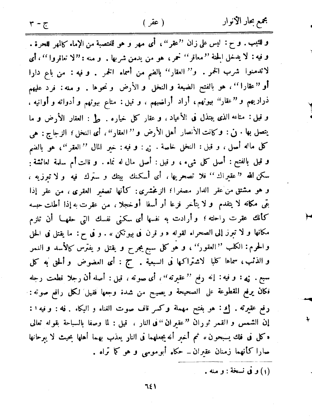 وللثيب. وح: ليس على زان "عقر"، أي مهر وهو للمغتصبة من الإماء كالمهر للحرة. وفيه: لا يدخل الجنة "معاقر" خمر، هو من يدمن شربها. ومنه: "لا تعاقروا"، أي لا تدمنوا شرب الخمر. و"العقار" بالضم من أسماء الخمر. وفيه: من باع دارًا أو "عقارًا"، هو بالفتح الضيعة والنخل والأرض ونحوها. ومنه: فرد عليهم ذراريهم و"عقار" بيوتهم، أراد أراضيهم، وقيل: متاع بيوتهم وأدواته وأوانيه، وقيل: متاعه الذي يبتذل في الأعياد، وعقار كل خياره. ط: العقار الأرض وما يتصل بها. ن: وكانت الأنصار أهل الأرض و"العقار"، أي النخل؛ الزجاج: هي كل ما له أصل، وقيل: النخل خاصة. نه: وفيه: خير المال "العقر"، هو بالضم وقيل بالفتح: أصل كل شيء، وقيل: أصل مال له نماء. وقالت أم سلمة لعائشة: سكن الله "عقيراك" فلا تصحريها، أي أسكنك بيتك وسترك فيه ولا تبرزيه، وهو مشتق من عقر الدار مصغرًا؛ الزمخشري: كأنها تصغير العقرى، من عقر إذا بقي مكانه لا يتقدم ولا يتأخر فزعًا أو أسفًا أو خجلًا، من عقرت به إذا أطلت حبسه كأنك عقرت راحلته؛ وأرادت به نفسها أي سكنى نفسك التي حقها أن تلزم مكانها ولا تبرز إلى الصحراء لقوله "وقرن في بيوتكن". وفي ح: ما يقتل في الحل والحرم: الكلب "العقور"، وهو كل سبع يجرح ويقتل ويفترس كالأسد والنمر والذئب، سماها كلبًا لاشتراكها في السبعية. ج: أي العضوض وألحق به كل سبع. نه: وفيه: إنه رفع "عقيرته"، أي صوته، قيل: أصله أن رجلًا قطعت رجله فكان يرفع المقطوعة على الصحيحة ويصيح من شدة وجعها فقيل لكل رافع صوته: رفع عقيرته. ك: هو بفتح مهملة وكسر قاف صوت الغناء والبكاء. نه: وفيه: إن الشمس والقمر ثوران "عقيران" في النار، قيل: لما وصفا بالسباحة بقوله تعالى "كل في فلك يسبحون" ثم أخبر أنه يجعلهما في النار يعذب بهما أهلها بحيث لا يبرحانها صارا كأنهما زمنان عقيران- حكاه أبو موسى وهو كما تراه.