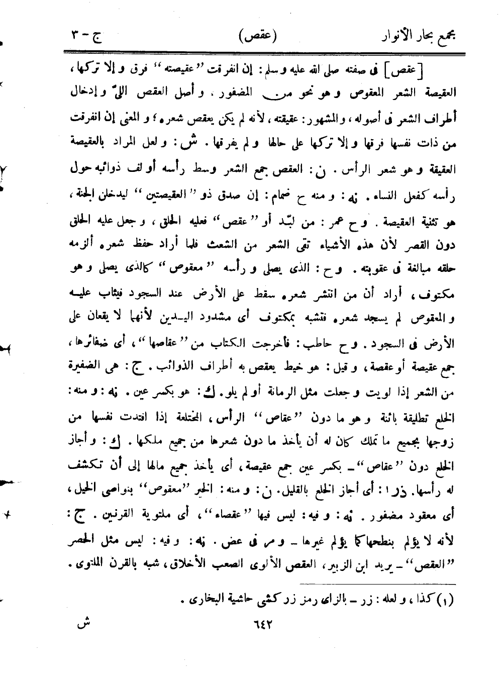 [عقص] في صفته صلى الله عليه وسلم: إن انفرقت "عقيصته" فرق وإلا تركها، العقيصة الشعر المعقوص وهو نحو من المضفور، وأصل العقص اللي وإدخال أطراف الشعر في أصوله، والمشهور: عقيقته، لأنه لم يكن يعقص شعره؛ والمعنى إن انفرقت من ذات نفسها فرقها وإلا تركها على حالها ولم يفرقها. ش: ولعل المراد بالعقيصة العقيقة وهو شعر الرأس. ن: العقص جمع الشعر وسط رأسه أو لف ذوائبه حول رأسه كفعل النساء. نه: ومنه ح ضمام: إن صدق ذو "العقيصتين" ليدخلن الجنة، هو تثنية العقيصة. وح عمر: من لبد أو "عقص" فعليه الحلق، وجعل عليه الحلق دون القصر لأن هذه الأشياء تقي الشعر من الشعث فلما أراد حفظ شعره ألزمه حلقه مبالغة في عقوبته. وح: الذي يصلي ورأسه "معقوص" كالذي يصلي وهو مكتوف، أراد أن من انتشر شعره سقط على الأرض عند السجود فيثاب عليه والمعقوص لم يسجد شعره فتشبه بمكتوف أي مشدود اليدين لأنهما لا يقعان على الأرض في السجود. وح حاطب: فأخرجت الكتاب من "عقاصها"، أي ضفائرها، جمع عقيصة أو عقصة، وقيل: هو خيط يعقص به أطراف الذوائب. ج: هي الضفيرة من الشعر إذا لويت وجعلت مثل الرمانة أو لم يلو. ك: هو بكسر عين. نه: ومنه: الخلع تطليقة بائنة وهو ما دون "عقاص" الرأس، المختلعة إذا افتدت نفسها من زوجها بجميع ما تملك كان له أن يأخذ ما دون شعرها من جميع ملكها. ك: وأجاز الخلع دون "عقاص"- بكسر عين جمع عقيصة، أي يأخذ جميع مالها إلى أن تكشف له رأسها. ذر: أي أجاز الخلع بالقليل. ن: ومنه: الخير "معقوص" بنواصي الخيل، أي معقود مضفور. نه: وفيه: ليس فيها "عقصاء"، أي ملتوية القرنين. ج: لأنه لا يؤلم بنطحها كما يؤلم غيرها- ومر في عض. نه: وفيه: ليس مثل الحصر "العقص"- يريد ابن الزبير، العقص الألوي الصعب الأخلاق، شبه بالقرن الملتوي.