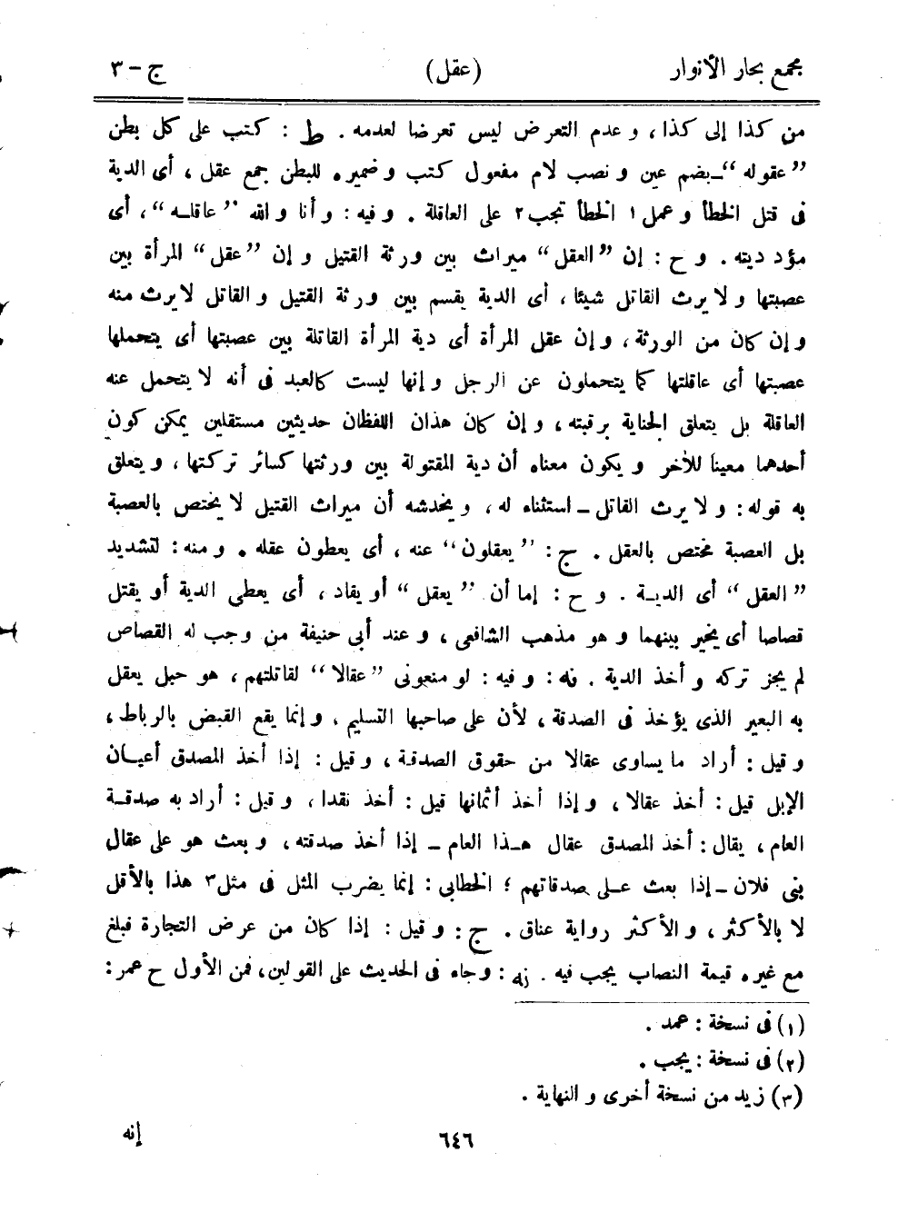 من كذا إلى كذا، وعدم التعرض ليس تعرضًا لعدمه. ط: كتب على كل بطن "عقوله"- بضم عين ونصب لام مفعول كتب وضميره للبطن جمع عقل، أي الدية في قتل الخطأ وعمل الخطأ تجب على العاقلة. وفيه: وأنا والله "عاقله"، أي مؤد ديته. وح: إن "العقل" ميراث بين ورثة القتيل وإن "عقل" المرأة بين عصبتها ولا يرث القاتل شيئًا، أي الدية يقسم بين ورثة القتيل والقاتل لا يرث منه وإن كان من الورثة، وإن عقل المرأة أي دية المرأة القاتلة بين عصبتها أي يتحملها عصبتها أي عاقلتها كما يتحملون عن الرجل وإنها ليست كالعبد في أنه لا يتحمل عنه العاقلة بل يتعلق الجناية برقبته، وإن كان هذان اللفظان حديثين مستقلين يمكن كون أحدهما معينًا للآخر ويكون معناه أن دية المقتولة بين ورثتها كسائر تركتها، ويتعلق به قوله: ولا يرث القاتل- استثناء له، ويخدشه أن ميراث القتيل لا يختص بالعصبة بل العصبة مختص بالعقل. ج: "يعقلون" عنه، أي يعطون عقله. ومنه: لتشديد "العقل" أي الدية. وح: إما أن "يعقل" أو يقاد، أي يعطي الدية أو يقتل قصاصًا أي يخير بينهما وهو مذهب الشافعي، وعند أبي حنيفة من وجب له القصاص لم يجز تركه وأخذ الدية. نه: وفيه: لو منعوني "عقالًا" لقاتلتهم، هو حبل يعقل به البعير الذي يؤخذ في الصدقة، لأن على صاحبها التسليم، وإنما يقع القبض بالرباط، وقيل: أراد ما يساوي عقالًا من حقوق الصدقة، وقيل: إذا أخذ المصدق أعيان الإبل قيل: أخذ عقالًا، وإذا أخذ أثمانها قيل: أخذ نقدًا، وقيل: أراد به صدقة العام، يقال: أخذ المصدق عقال هذا العام- إذا أخذ صدقته، وبعث هو على عقال بني فلان- إذا بعث على صدقاتهم؛ الخطابي: إنما يضرب المثل في مثل هذا بالأقل لا بالأكثر، والأكثر رواية عناق. ج: وقيل: إذا كان من عرض التجارة فبلغ مع غيره قيمة النصاب يجب فيه. نه: وجاء في الحديث على القولين، فمن الأول ح عمر:
