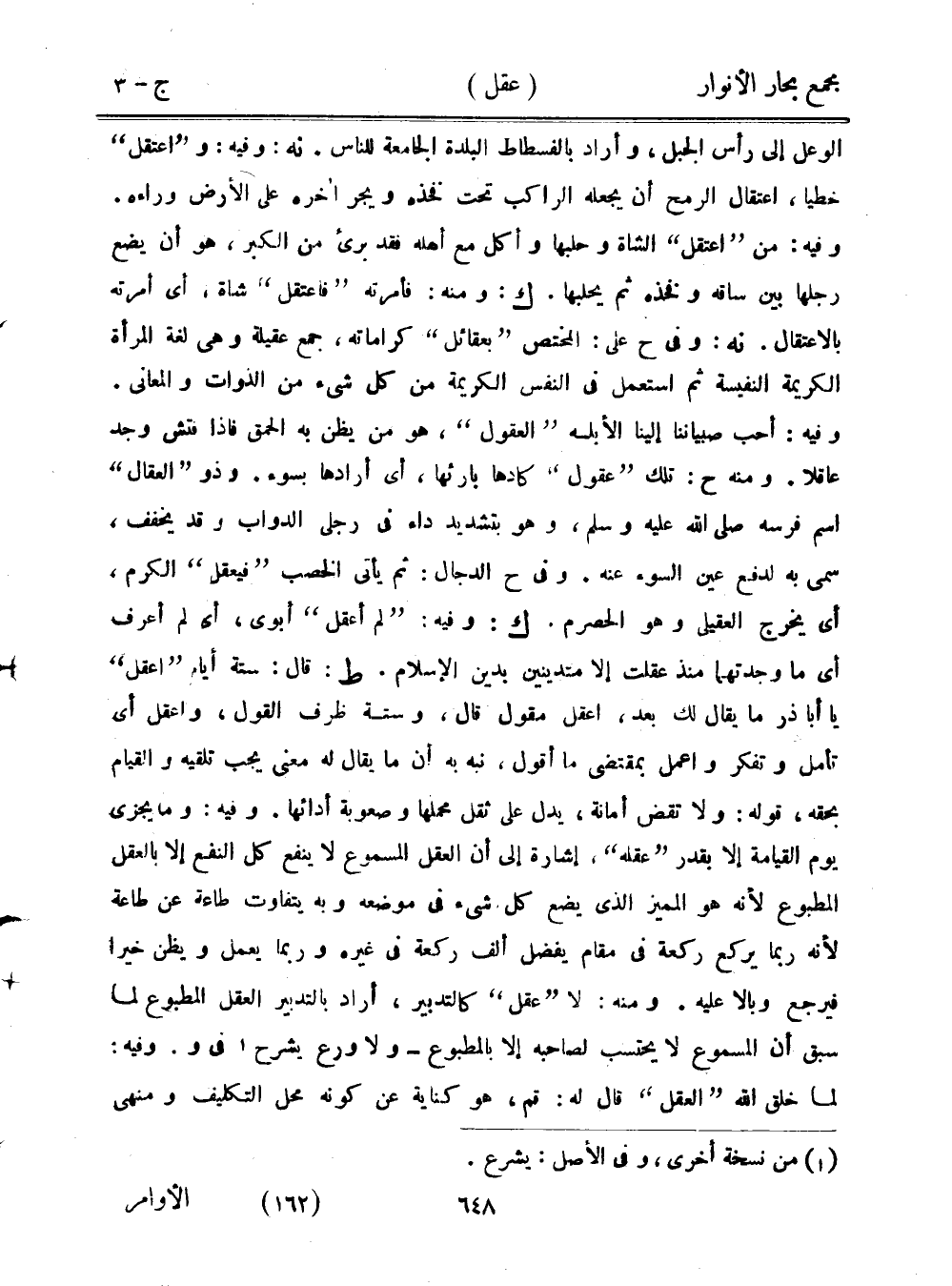 الوعل إلى رأس الجبل، وأراد بالفسطاط البلدة الجامعة للناس. نه: وفيه: و"اعتقل" خطيًا، اعتقال الرمح أن يجعله الراكب تحت فخذه ويجر آخره على الأرض وراءه. وفيه: من "اعتقل" الشاة وحلبها وأكل مع أهله فقد برئ من الكبر، هو أن يضع رجلها بين ساقه وفخذه ثم يحلبها. ك: ومنه: فأمرته "فاعتقل" شاة، أي أمرته بالاعتقال. نه: وفي ح على: المختص "بعقائل" كراماته، جمع عقيلة وهي لغة المرأة الكريمة النفيسة ثم استعمل في النفس الكريمة من كل شيء من الذوات والمعاني. وفيه: أحب صبياننا إلينا الأبله "العقول"، هو من يظن به الحمق فإذا فتش وجد عاقلًا. ومنه ح: تلك "عقول" كادها بارئها، أي أرادها بسوء. وذو "العقال" اسم فرسه صلى الله عليه وسلم، وهو بتشديد داء في رجلي الدواب وقد يخفف، سمي به لدفع عين السوء عنه. وفي ح الدجال: ثم يأتي الخصب "فيعقل" الكرم، أي يخرج العقيلي وهو الحصرم. ك: وفيه: "لم أعقل" أبوي، أي لم أعرف أي ما وجدتهما منذ عقلت إلا متدينين بدين الإسلام. ط: قال: ستة أيام "أعقل" يا أبا ذر ما يقال لك بعد، أعقل مقول قال، وستة ظرف القول، واعقل أي تأمل وتفكر واعمل بمقتضى أمانة، يدل على ثقل محملها وصعوبة أدائها. وفيه: وما يجزى يوم القيامة إلا بقدر "عقله"، إشارة إلى أن العقل المسموع لا ينفع كل النفع إلا بالعقل المطبوع لأنه هو المميز الذي يضع كل شيء في موضعه وبه يتفاوت طاعة عن طاعة لأنه ربما يركع ركعة في مقامي فضل ألف ركعة في غيره وربما يعمل ويظن خيرًا فيرجع وبالًا عليه. ومنه: لا "عقل" كالتدبير، أراد بالتدبير العقل المطبوع لما سبق أن المسموع لا يحتسب لصاحبه إلا بالمطبوع- ولا ورع يشرح في و. وفيه: لما خلق الله "العقل" قال له: قم، هو كناية عن كونه محل التكليف ومنهي