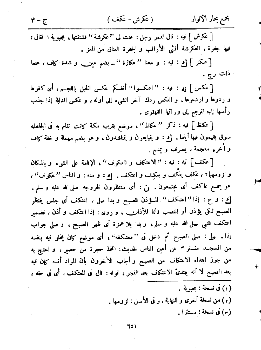 [عكف] نه: فيه: "الاعتكاف والعكوف"، الإقامة على الشيء وبالمكان ولزومهما، عكف يعكف ويعكف واعتكف. ك: ومنه: والناس "عكوف"، هو جمع عاكف أي مجتمعون. ن: أي منتظرون لخروجه صلى الله عليه وسلم. ك: وح: إذا "اعتكف" المؤذن للصبح وبدا صلى، اعتكف أي جلس ينتظر الصبح لكي يؤذن أو انتصب قائمًا للأذان، وروى: إذا اعتكف وأذن، فضمير اعتكف للنبي صلى الله عليه وسلم، وبدا بلا همزة أي ظهر الصبح، وصلى جواب إذًا. ط: صلى الصبح ثم دخل في "معتكفه"، أي موضع كان يخلو فيه بنفسه من المسجد متسترًا عن أعين الناس لحديث: اتخذ حجرة من حصير، واحتج به من جوز ابتداء الاعتكاف من الصبح وأجاب الآخرون بأن المراد أنه كان فيه بعد الصبح لا أنه يبتدئ الاعتكاف بعد الفجر، قوله: قال في المعتكف، أي في حقه،
