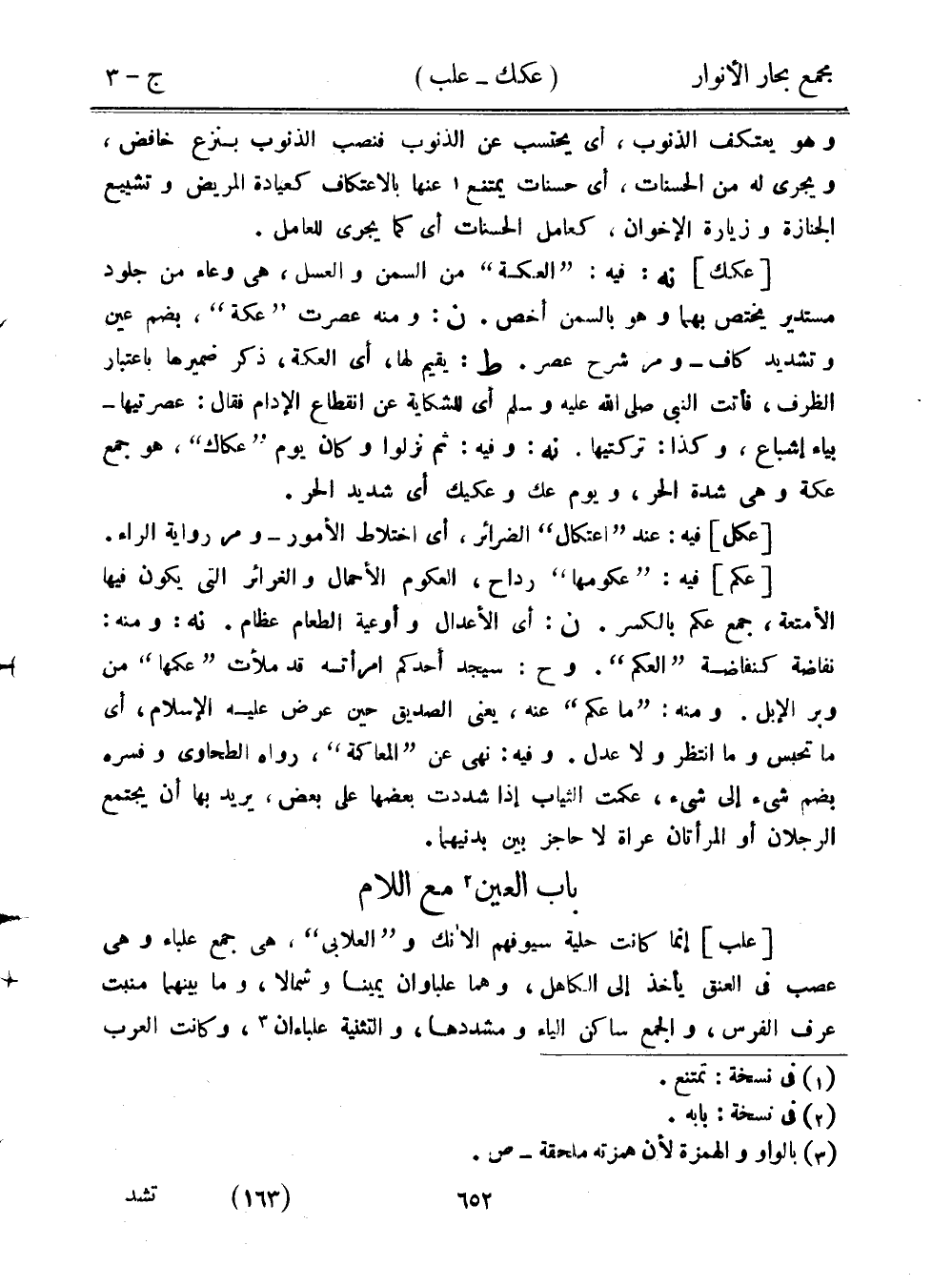 [عكم] فيه: "عكومها" رداح، العكوم الأحمال والغرائر التي يكون فيها الأمتعة، جمع عكم بالكسر. ن: أي الأعدال وأوعية الطعام عظام. نه: ومنه: نفاضة كنفاضة "العكم". وح: سيجد أحدكم امرأته قد ملأت "عكمها" من وبر الإبل. ومنه: "ما عكم" عنه، يعني الصديق حين عرض عليه الإسلام، أي ما تحبس وما انتظر ولا عدل. وفيه: نهى عن "المعاكمة"، رواه الطحاوي وفسره بضم شيء إلى شيء، عكمت الثياب إذا شددت بعضها على بعض، يريد بها أن يجتمع الرجلان أو المرأتان عراة لا حاجز بين بدنيهما.