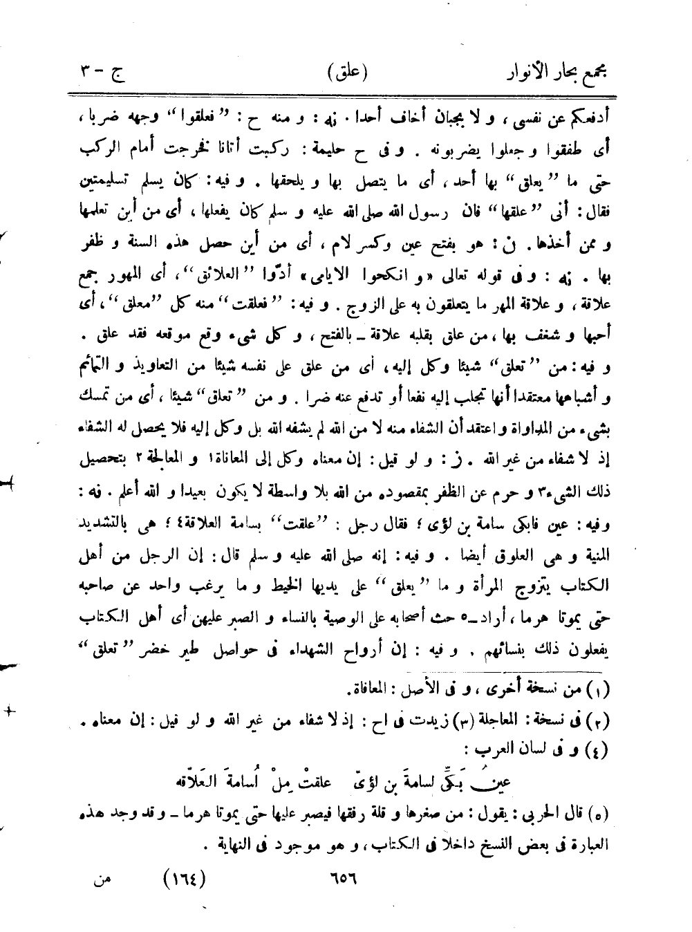 أدفعكم عن نفسي، ولا بجبان أخاف أحدًا. نه: ومنه ح: "فعلقوا" وجهه ضربًا، أي طفقوا وجعلوا يضربونه. وفي ح حليمة: ركبت أتانا فخرجت أمام الركب حتى ما "يعلق" بها أحد، أي ما يتصل بها ويلحقها. وفيه: كان يسلم تسليمتين فقال: أني "علقها" فإن رسول الله صلى الله عليه وسلم كان يفعلها، أي من أين تعلمها وممن أخذها. ن: هو بفتح عين وكسر لام، أي من أين حصل هذه السنة وظفر بها. نه: وفي قوله تعالى "وانكحوا الأيامى" أدوا "العلائق"، أي المهور جمع علاقة، وعلاقة المهر ما يتعلقون به على الزوج. وفيه: "فعلقت" منه كل "معلق"، أي أحبها وشغف بها، من علق بقلبه علاقة- بالفتح، وكل شيء وقع موقعه فقد علق. وفيه: من "تعلق" شيئًا وكل إليه، أي من علق على نفسه شيئًا من التعاويذ والتمائم وأشباهها معتقدًا أنها تجلب إليه نفعًا أو تدفع عنه ضرًا. ومن "تعلق" شيئًا، أي من تمسك بشيء من المداواة واعتقد أن الشفاء منه لا من الله لم يشفه الله بل وكل إليه فلا يحصل له الشفاء إذ لا شفاء من غير الله. ز: ولو قيل: إن معناه وكل إلى المعاناة والمعالجة بتحصيل ذلك الشيء وحرم عن الظفر بمقصوده من الله بلا واسطة لا يكون بعيدًا والله أعلم. نه: وفيه: عين فأبكى سامة بن لؤي؛ فقال رجل: "علقت" بسامة العلاقة؛ هي بالتشديد المنية وهي العلوق أيضًا. وفيه: إنه صلى الله عليه وسلم قال: إن الرجل من أهل الكتاب يتزوج المرأة وما "يعلق" على يديها الخيط وما يرغب واحد عن صاحبه حتى يموتا هرمًا، أراد- حث أصحابه على الوصية بالنساء والصبر عليهن أي أهل الكتاب يفعلون ذلك بنسائهم، وفيه: إن أرواح الشهداء في حواصل طير خضر "تعلق"