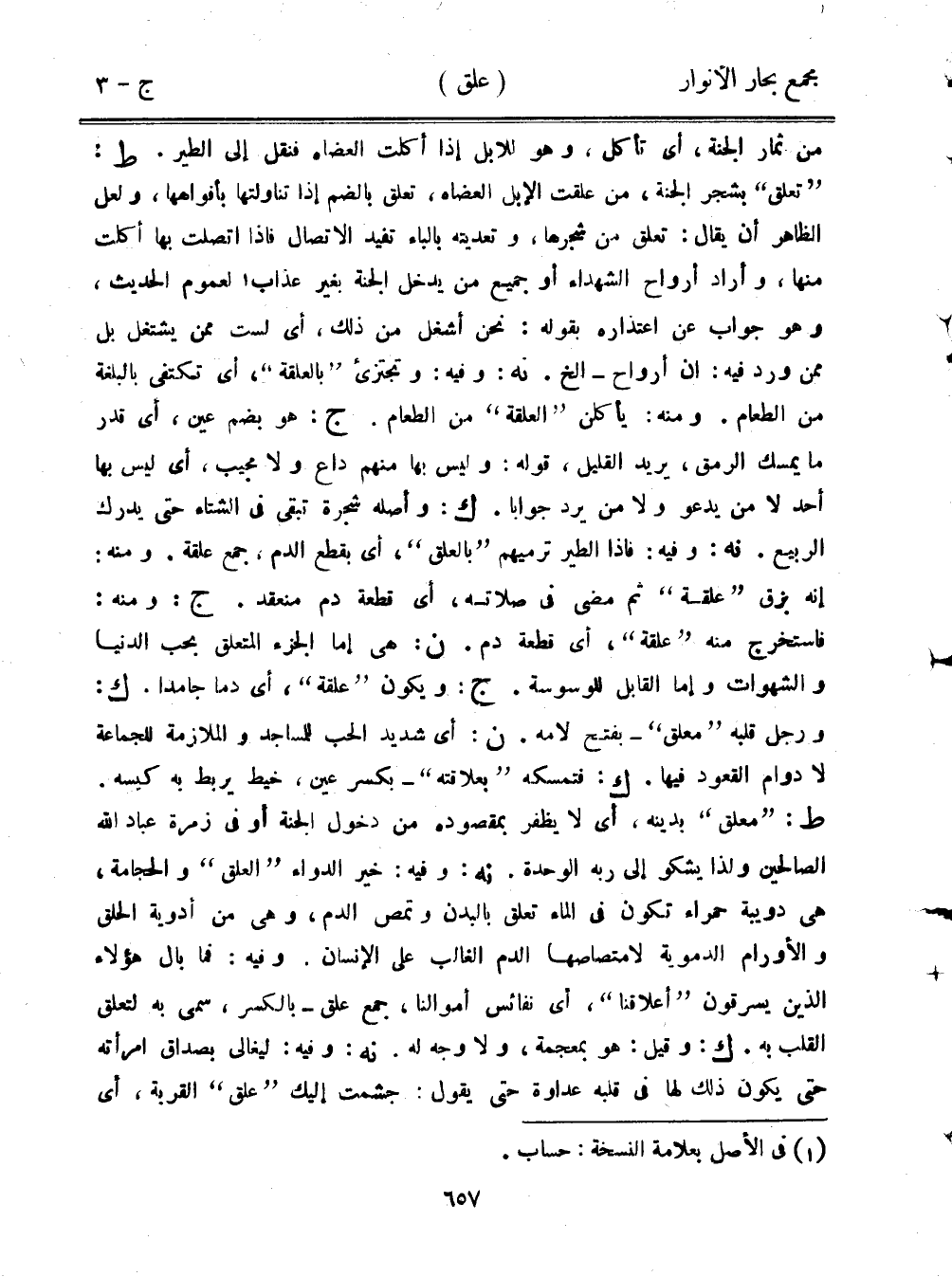 من ثمار الجنة، أي تأكل، وهو للإبل إذا أكلت العضاه فنقل إلى الطير. ط: "تعلق" بشجر الجنة، من علقت الإبل العضاه، تعلق بالضم إذا تناولتها بأفواهها، ولعل الظاهر أن يقال: تعلق من شجرها، وتعديته بالباء تفيد الاتصال فإذا اتصلت بها أكلت منها، واراد أرواح الشهداء أو جميع من يدخل الجنة بغير عذاب لعموم الحديث، وهو جواب عن اعتذاره بقوله: نحن أشغل من ذلك، أي لست ممن يشتغل بل ممن ورد فيه: أن أرواح- إلخ. نه: وفيه: وتجتزئ "بالعلقة"، أي تكتفي بالبلغة من الطعام. ومنه: يأكلن "العلقة" من الطعام. ج: هو بضم عين، أي قدر ما يمسك الرمق، يريد القليل، قوله: وليس بها منهم داع ولا مجيب، أي ليس بها أحد لا من يدعو ولا من يرد جوابًا. ك: وأصله شجرة تبقى في الشتاء حتى يدرك الربيع. نه: وفيه: فإذا الطير ترميهم "بالعلق"، أي بقطع الدم، جمع علقة. ومنه: إنه بزق "علقة" ثم مضى في صلاته، أي قطعة دم منعقد. ج: ومنه: فاستخرج منه "علقة"، أي قطعة دم. ن: هي إما الجزء المتعلق بحب الدنيا والشهوات وإما القابل للوسوسة. ج: ويكون "علقة"، أي دمًا جامدًا. ك: ورجل قلبه "معلق"- بفتح لامه. ن: أي شديد الحب للمساجد والملازمة للجماعة لا دوام القعود فيها. ك: فتمسكه "بعلاقته"- بكسر عين، خيط يربط به كيسه. ط: "معلق" بدينه، أي لا يظفر بمقصوده من دخول الجنة أو في زمرة عباد الله الصالحين ولذا يشكو إلى ربه الوحدة. نه: وفيه: خير الدواء "العلق" والحجامة، هي دويبة حمراء تكون في الماء تعلق بالبدن وتمص الدم، وهي من أدوية الحلق والأورام الدموية لامتصاصها الدم الغالب على الإنسان. وفيه: فما بال هؤلاء الذين يسرقون "أعلاقنا"، أي نفائس أموالنا، جمع علق- بالكسر، سمي به لتعلق القلب به. ك: وقيل: هو بمعجمة، ولا وجه له. نه: وفيه: ليغالي بصداق امرأته حتى يكون ذلك لها في قلبه عداوة حتى يقول: جشمت إليك "علق" القربة، أي