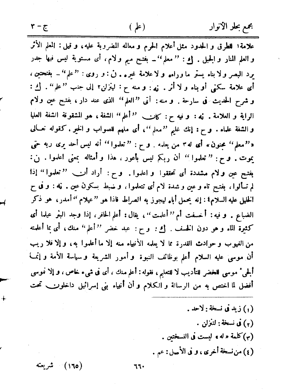 علامة للطرق والحدود مثل أعلام الحرم ومعالمه المضروبة عليه، وقيل: المعلم الأثر والعلم المنار والجبل. ك: "معلم"- بفتح ميم ولام، أي مستوية ليس فيها جدر يرد البصر ولا بناء يستر ما وراءه ولا علامة غيره. ن: وروى: "علم"- بفتحتين، أي علامة سكنى أو بناء ولا أثر. نه: ومنه ح: لينزلن إلى جنب "علم". ك: وشرح الحديث في سارحة. ومنه: أتى "العلم" الذي عند دار، بفتح عين ولام الراية والعلامة. نه: وفيه ح: كان "أعلم" الشفة، هو المشقوقة الشفة العليا والشفة علماء. وح: إنك غليم "معلم"، أي ملهم للصواب والخير، كقوله تعالى ""معلم" مجنون" أي له من يعلمه. وح: "تعلموا" أنه ليس أحد يرى ربه حتى يموت. وح: "تعلموا" أن ربكم ليس بأعور، هذا وأمثاله بمعنى اعلموا. ن: بفتح عين ولام مشددة أي تحققوا واعلموا. وح: أراد أن "تعلموا" إذا لم تسألوا، بفتح تاء وعين وشدة لام أي تتعلموا، وضبط بسكون عين. نه: وفي ح الخليل عليه السلام: إنه يحمل أباه ليجوز به الصراط فإذا هو "عيلام" أمدر، هو ذكر الضباع. وفيه: أخسفت أم "أعلمت"، يقال: أعلم الحافر، إذا وجد البئر عيلمًا أي كثيرة الماء وهو دون الخسف. ك: وح: عبد خضر "أعلم" منك، أي بما أعلمته من الغيوب وحوادث القدرة مما لا يعلمه الأنبياء منه إلا ما أعلموا به، وإلا فلا ريب أن موسى عليه السلام أعلم بوظائف النبوة وأمور الشريعة وسياسة الأمة وإنما ألجئ موسى للخضر للتأديب لا للتعليم، فقوله: أعلم منك، أي في شيء خاص، وإلا فموسى أفضل لما اختص به من الرسالة والكلام وأن أنبياء بني إسرائيل داخلون تحت