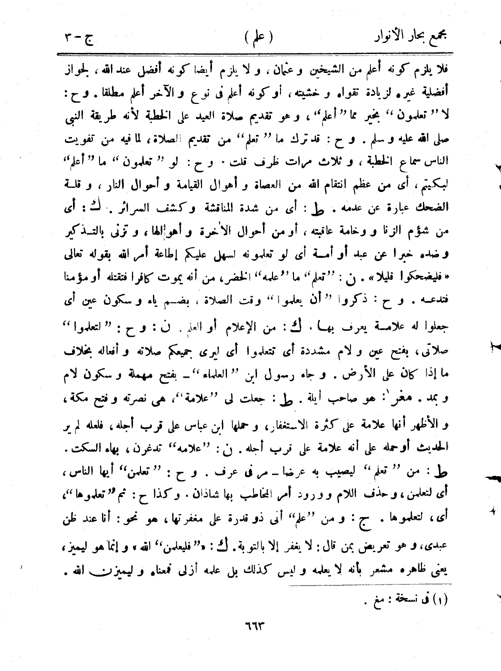 فلا يلزم كونه أعلم من الشيخين وعثمان، ولا يلزم أيضًا كونه أفضل عند الله، لجواز أفضلية غيره لزيادةتقواه وخشيته، أو كونه أعلم في نوع والآخر أعلم مطلقًا. وح: لا "تعلمون" بخير مما "أعلم"، وهو تقديم صلاة العيد على الخطبة لأنه طريقة النبي صلى الله عليه وسلم. وح: قد ترك ما "تعلم" من تقديم الصلاة، لما فيه من تفويت الناس سماع الخطبة، وثلاث مرات ظرف قلت. وح: لو "تعلمون" ما "أعلم" لبكيتم، أي من عظم انتقام الله من العصاة وأهوال القيامة وأحوال النار، وقلة الضحك عبارة عن عدمه. ط: أي من شدة المناقشة وكشف السرائر. ك: أي من شؤم الزنا ووخامة عاقبته، أو من أحوال الآخرة وأهوالها، وتزني بالتذكير وضده خبرًا عن عبد أو أمة أي لو تعلمونه لسهل عليكم إطاعة أمر الله بقوله تعالى "فليضحكوا قليلًا". ن: "تعلم" ما "علمه" الخضر، من أنه يموت كافرًا فتقتله أو مؤمنًا فتدعه. وح: ذكروا "أن يعلموا" وقت الصلاة، بضم ياء وسكون عين أي جعلوا له علامة يعرف بها. ك: من الإعلام أو العلم. ن: وح: "لتعلموا" صلاتي، بفتح عين ولام مشددة أي تتعلموا أي ليرى جميعكم صلاته وأفعاله بخلاف ما إذا كان على الأرض. وجاء رسول ابن "العلماء"- بفتح مهملة وسكون لام وبمد. مغر: هو صاحب أيلة. ط: جعلت لي "علامة"، هي نصرته وفتح مكة، والأظهر أنها علامة على كثرة الاستغفار، وحملها ابن عباس على قرب أجله، فلعله لم ير الحديث أو حمله على أنه علامة على قرب أجله. ن: "علامه" تدغرن، بهاء السكت. ط: من "تعلم" ليصيب به عرضًا- مر في عرف. وح: "تعلمن" أيها الناس، أي لتعلمن، وحذف اللام وورود أمر المخاطب بها شاذان. وكذا ح: ثم "تعلموها"، أي، لتعلموها. ج: ومن "علم" أني ذو قدرة على مغفرتها، هو نحو: أنا عند ظن عبدي، وهو تعريض بمن قال: لا يغفر إلا بالتوبة. ك: "فليعلمن" الله" وإنما هو ليميز، يعني ظاهره مشعر بأنه لا يعلمه وليس كذلك بل علمه أزلي فمعناه وليميزن الله.