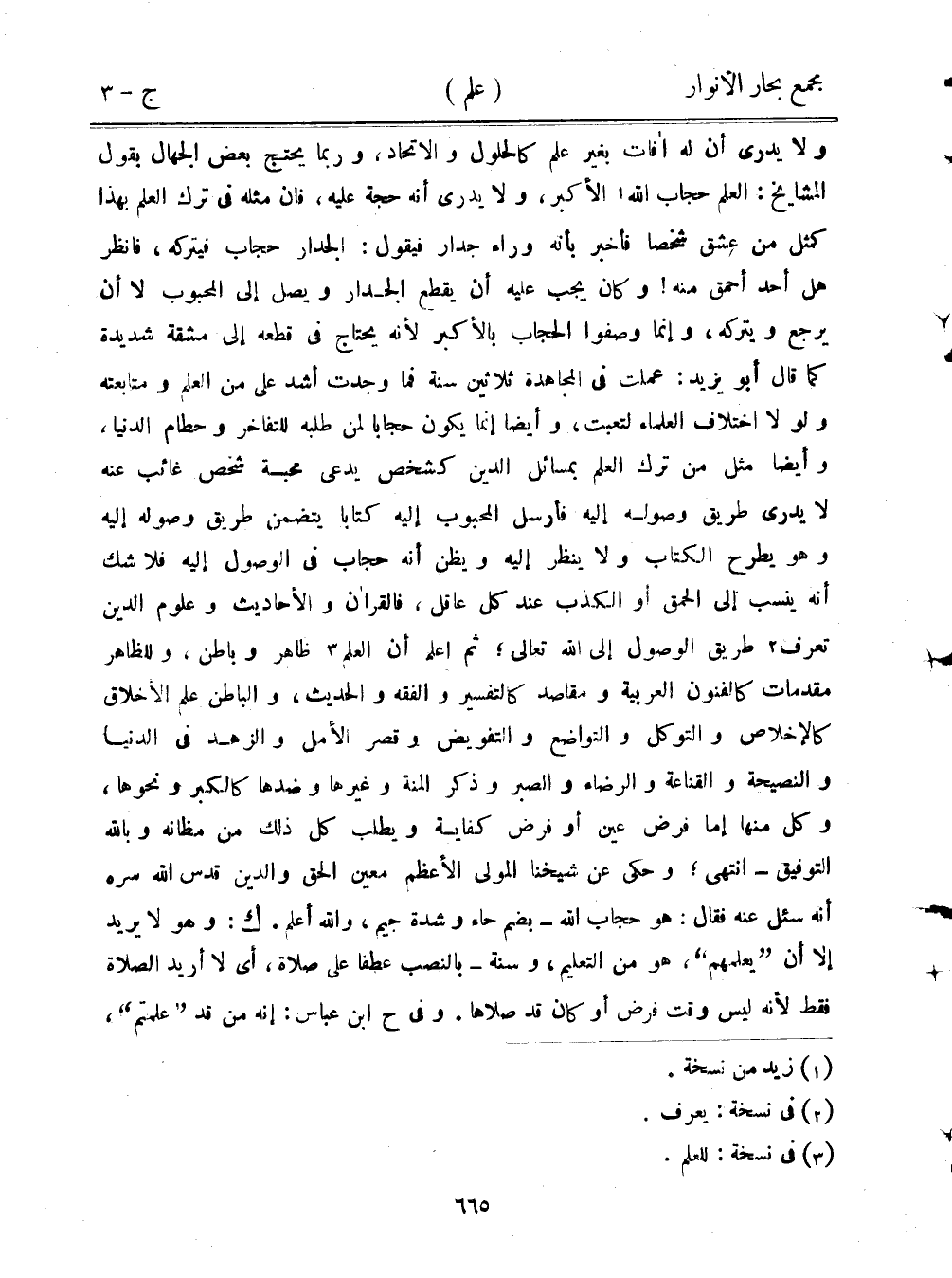 ولا يدري أن له آفات بغير علم كالحلول والاتحاد، وربما يحتج بعض الجهال بقول المشايخ: العلم حجاب الله الأكبر، ولا يدري أنه حجة عليه، فإن مثله في ترك العلم بهذا كمثل من عشق شخصًا فأخبر بأنه وراء جدار فيقول: الجدار حجاب فيتركه، فانظر هل أحد أحمق منه! وكاني جب عليه أن يقطع الجدار ويصل إلى المحبوب لا أن يرجع ويتركه، وإنما وصفوا الحجاب بالأكبر لأنه يحتاج في قطعه إلى مشقة شديدة كما قال أبو يزيد: عملت في المجاهدة ثلاثين سنة فما وجدت أشد علي من العلم ومتابعته ولولا اختلاف العلماء لتعبت، وأيضًا إنما يكون حجابًا لمن طلبه للتفاخر وحطام الدنيا، وأيضًا مثل من ترك العلم بمسائل الدين كشخص يدعي محبة شخص غائب عنه لا يدري طريق وصوله إليه فأرسل المحبوب إليه كتابًا يتضمن طريق وصوله إليه وهو يطرح الكتاب ولا ينظر إليه ويظن أنه حجاب في الوصول إليه فلا شك أنه ينسب إلى الحمق أو الكذب عند كل عاقل، فالقرآن والأحاديث وعلوم الدين تعرف طريق الوصول إلى الله تعالى؛ ثم اعلم أن العلم ظاهر وباطن، وللظاهر مقدمات كالفنون العربية ومقاصد كالتفسير والفقه والحديث، والباطن علم الأخلاق كالإخلاص والتوكل والتواضع والتفويض وقصر الأمل والزهد في الدنيا والنصيحة والقناعة والرضاء والصبر وذكر المنة وغيرها وضدها كالكبر ونحوها، وكل منها إما فرض عين أو فرض كفاية ويطلب كل ذلك من مظانه وبالله التوفيق- انتهى؛ وحكى عن شيخنا المولى الأعظم معين الحق والدين قدس الله سره أنه سئل عنه فقال: هو حجاب الله- بضم حاء وشدة جيم، والله أعلم. ك: وهو لا يريد إلا أن "يعلمهم"، هو من التعليم، وسنة- بالنصب عطفًا على صلاة، أي لا أريد الصلاةف قط لأنه ليس وقت فرض أو كان قد صلاها. وفي ح ابن عباس: إنه من قد "علمتم"،
