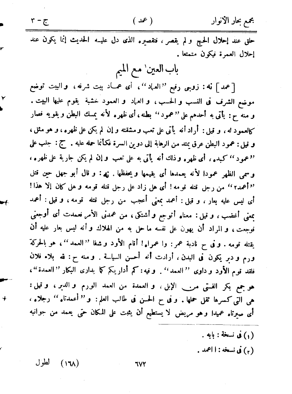 [عمد] نه: زوجي رفيع "العماد"، أي عماد بيت شرفه، والبيت توضع موضع الشرف في النسب والحسب، والعماد والعمود خشبة يقوم عليها البيت. ومنه ح: يأتي به أحدهم على "عمود" بطنه، أي ظهره لأنه يمسك البطن ويقويه فصار كالعمود له، وقيل: أراد أنه يأتي على تعب ومشقته وإن لم يكن على ظهره، وهو مثل، وقيل: عمود البطن عرق يمتد من الرهابة إلى دوين السرة فكأنما حمله عليه. ج: جلب على "عمود" كبده، أي ظهره وذلك أنه يأتي به على تعب وإن لم يكن جارية على ظهره، وسمي الظهر عمودًا لأنه يعمدها أي يقيمها ويحفظها. نه: وقال أبو جهل حين قتل "أعمد" من رجل قتله قومه! أي هل زاد على رجل قتله قومه وهل كان إلا هذا! أي ليس عليه بعار، وقيل: أعمد بمعنى أعجب من رجل قتله قومه، وقيل: أعمد بمعنى أغضب، وقيل: معناه أتوجع وأشتكي، من عمدني الأمر فعمدت أي أوجعني فوجعت، والمراد أن يهون على نفسه ما حل به من الهلاك وأنه ليس بعار عليه أن يقتله قومه. وفي ح نادبة عمر: وا عمراه! أقام الأود وشفا "العمد"، هو بالحركة ورم ودبر يكون في البدن، أرادت أنه أحسن السياسة. ومنه ح: لله بلاء فلان فلقد قوم الأود وداوى "العمد". وفيه: كم أداريكم كما يداري البكار "العمدة"، هو جمع بكر الفتى من الإبل، والعمدة من العمد الورم والدبر، وقيل: هي التي كسرها ثقل حملها. وفي ح الحسن في طالب العلم: و"أعمدتاه" رجلاه، أي صيرتاه عميدًا وهو مريض لا يستطيع أن يثبت على المكان حتى يعمد من جوانبه