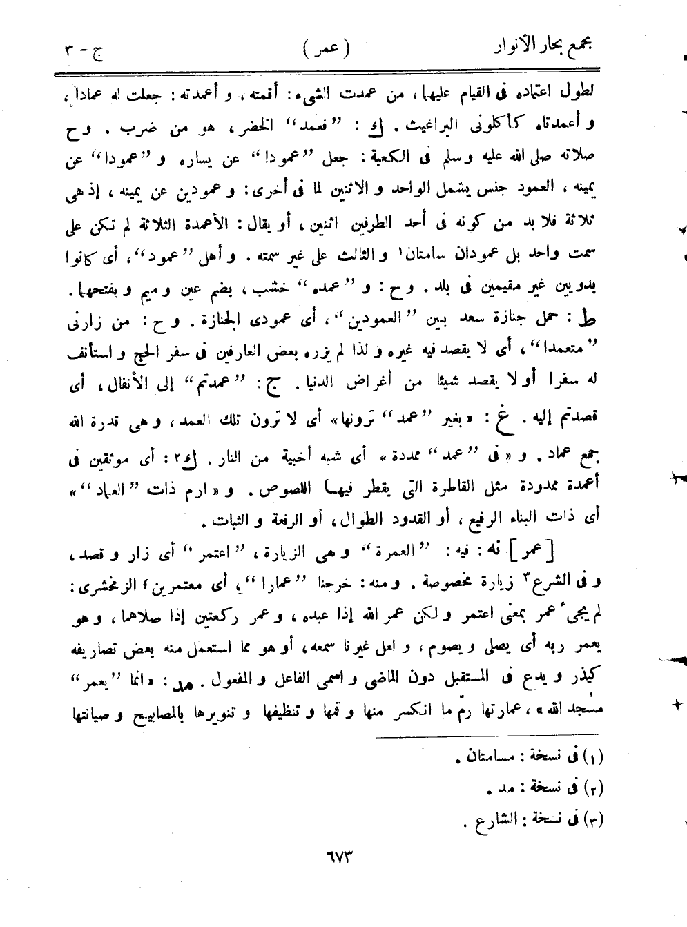 لطول اعتماده في القيام عليهما، من عمدت الشيء: أقمته، وأعمدته: جعلت له عمادًا، وأعمدتاه كأكلوني البراغيث. ك: "فعمد" الخضر، هو من ضرب. وح صلاته صلى الله عليه وسلم في الكعبة: جعل "عمودًا" عن يساره و"عمودًا" عن يمينه، العمود جنس يشمل الواحد والاثنين لما في أخرى: وعمودين عن يمينه، إذ هي ثلاثة فلابد من كونه في أحد الطرفين اثنين، أو يقال: الأعمدة الثلاثة لم تكن على سمت واحد بل عمودان سامتان والثالث على غير سمته. وأهل "عمود"، أي كانوا بدويين غير مقيمين في بلد. وح: و"عمده" خشب، بضم عين وميم وبفتحهما. ط: حمل جنازة سعد بين "العمودين"، أي عمودي الجنازة. وح: من زارني "متعمدًا"، أي لا يقصد فيه غيره ولذا لم يزره بعض العارفين في سفر الحج واستأنف له سفرًا أو لا يقصد شيئًا من أغراض الدنيا. ج: "عمدتم" إلى الأنفال، أي قصدتم غليه. غ: "بغير "عمد" ترونها" أي لا ترون تلك العمد، وهي قدرة الله جمع عماد. و"في "عمد" ممددة" أي شبه أخبية من النار. ك: أي موثقين في أعمدة ممدودة مثل القاطرة التي يقطر فيها اللصوص. و"ارم ذات "العماد"" أي ذات البناء الرفيع، أو القدود الطوال، أو الرفعة والثبات.