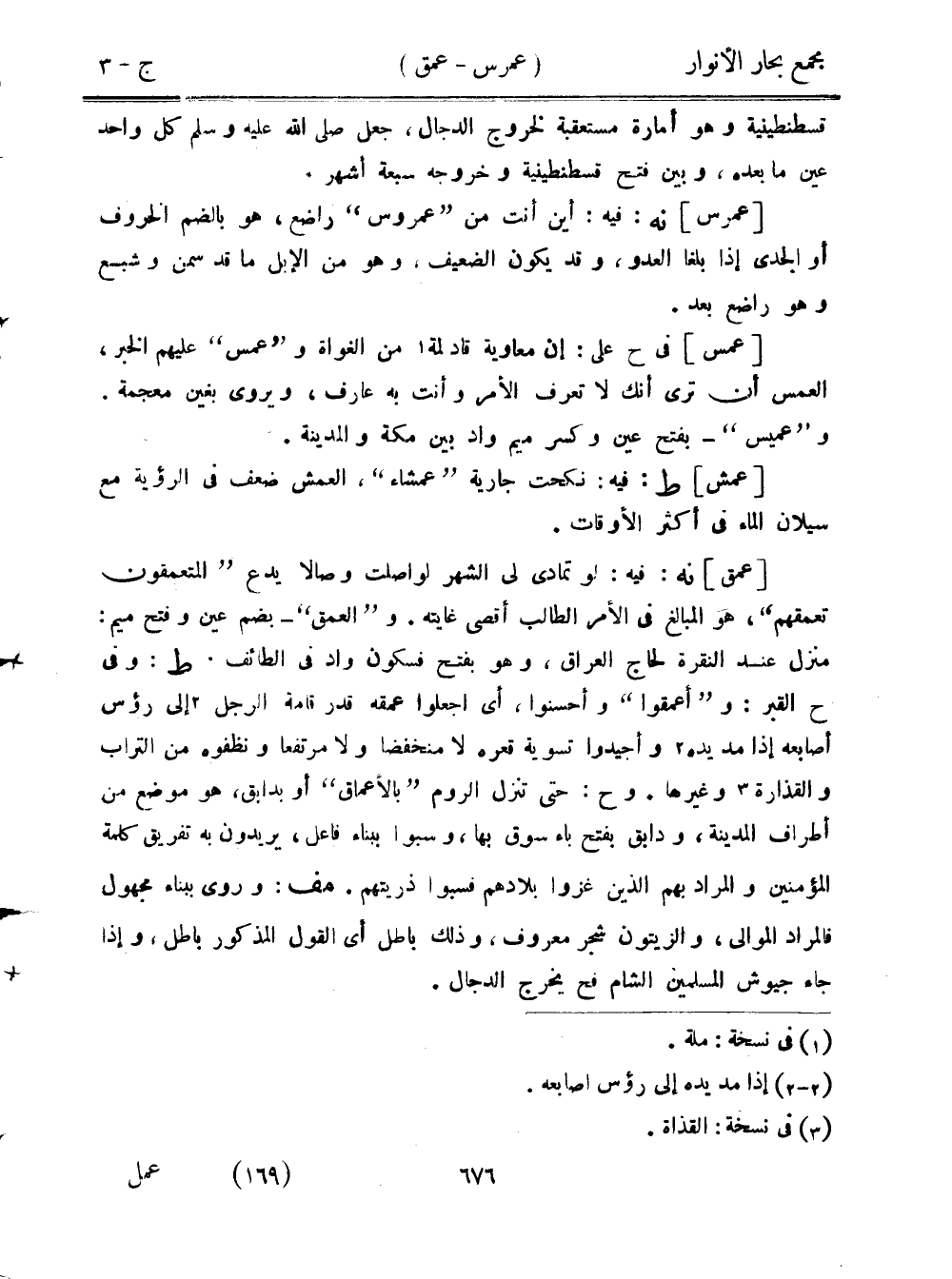 [عمق] نه: فيه: لو تمادى لي الشهر لواصلت وصالًا يدع "المتعمقون تعمقهم"، هو المبالغ في الأمر الطالب أقصى غايهت. و"العمق"- بضم عين وفتح ميم: منزل عند النقرة لحاج العراق، وهو بفتح فسكون واد في الطائف. ط: وفي ح القبر: و"أعمقوا" وأحسنوا، أي اجعلوا عمقه قدر قامة الرجل إلى رؤس أصابعه إذا مد يده وأجيدوا تسوية قعره لا منخفضًا ولا مرتفعًا ونظفوه من التراب والقذارة وغيرها. وح: حتى تنزل الروم "بالأعماق" أو بدابق، هو موضع من أطراف المدينة، ودابق بفتح باء سوق بها، وسبوا ببناء فاعل، يريدون به تفريق كلمة المؤمنين والمراد بهم الذين غزوا بلادهم فسبوا ذريتهم. مف: وروى ببناء مجهول فالمراد الموالي، والزيتون شجر معروف، وذلك باطل أي القول المذكور باطل، وإذا جاء جيوش المسلمين الشام فح يخرج الدجال.