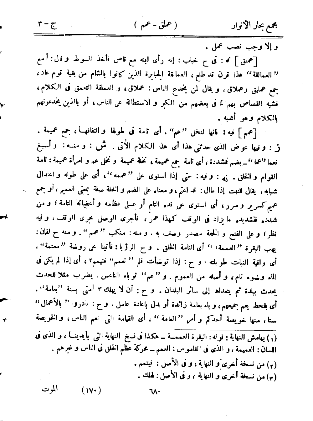 [عمم] فيه: فإنها لنخل "عم"، أي تامة في طولها والتفافها، جمع عميمة. ز: وفيها عوض الذي حدثني هذا أي هذا الكلام الآتي. ش: ومنه: وأسبغ نعما "عما"- بضم فمشددة، أي تامة جمع عميمة، نخلة عميمة ونخل عم وامرأة عميمة: تامة القوام والخلق. نه: وفيه: حتى إذا استوى على "عممه"، أي على طوله واعتدال شبابه، يقال للنبت إذا طال: قد اعتم، ومعناه على الضم والخفة صفة بمعنى العميم، أو جمع عميم كسرير وسرر، أي استوى على قده التام أو على عظامه وأعضائه الامة؛ ومن شدده فتشديده ما يزاد في الوقف كهذا عمر، فأجرى الوصل مجرى الوقف، وفيه نظر؛ وعلى الفتح والخفة مصدر وصف به. ومنه: منكب "عمم". ومنه ح لقمان: يهب البقرة "العممة" أي التامة الخلق. وح الرؤيا: فأتينا على روضة "معتمة"، أي وافية النبات طويلته. وح: إذا توضأت فلم "تعمم" فتيمم، أي إذا لم يكن في الماء وضوء تام، وأصله من العموم. و"عم" ثوباء الناعس. يضرب مثلًا للحدث يحدث ببلدة ثم يتعداها إلى سائر البلدان. وح: أن لا يهلك أمتي بسنة "بعامة"، أي بقحط يعم جميعهم، وباء بعامة زائدة أو بدل بإعادة عامل. وح: بادروا "بالأمال" ستًا، منها خويصة أحدكم وأمر "العامة"، أي القيامة التي تعم الناس، والخويصة
