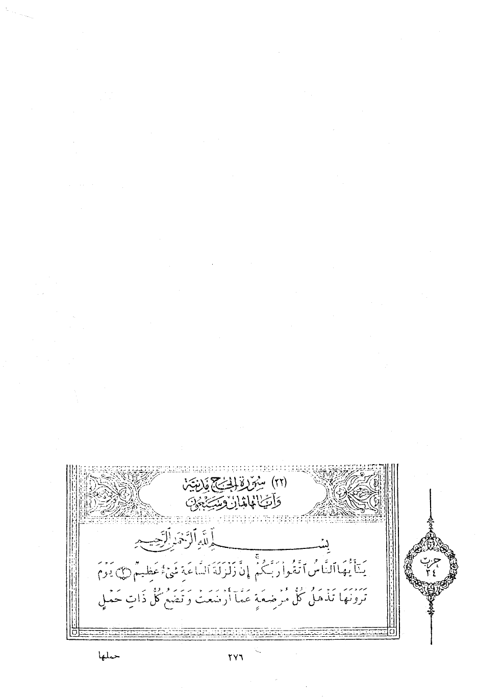 يا أَيُّهَا النَّاسُ اتَّقُوا رَبَّكُمْ إِنَّ زَلْزَلَةَ السَّاعَةِ شَيْءٌ عَظِيمٌ (1) يَوْمَ تَرَوْنَها تَذْهَلُ كُلُّ مُرْضِعَةٍ عَمَّا أَرْضَعَتْ وَتَضَعُ كُلُّ ذاتِ حَمْلٍ حَمْلَها وَتَرَى النَّاسَ سُكارى وَما هُمْ بِسُكارى وَلكِنَّ عَذابَ اللَّهِ شَدِيدٌ (2) وَمِنَ النَّاسِ مَنْ يُجادِلُ فِي اللَّهِ بِغَيْرِ عِلْمٍ وَيَتَّبِعُ كُلَّ شَيْطانٍ مَرِيدٍ (3) كُتِبَ عَلَيْهِ أَنَّهُ مَنْ تَوَلاَّهُ فَأَنَّهُ يُضِلُّهُ وَيَهْدِيهِ إِلى عَذابِ السَّعِيرِ (4)