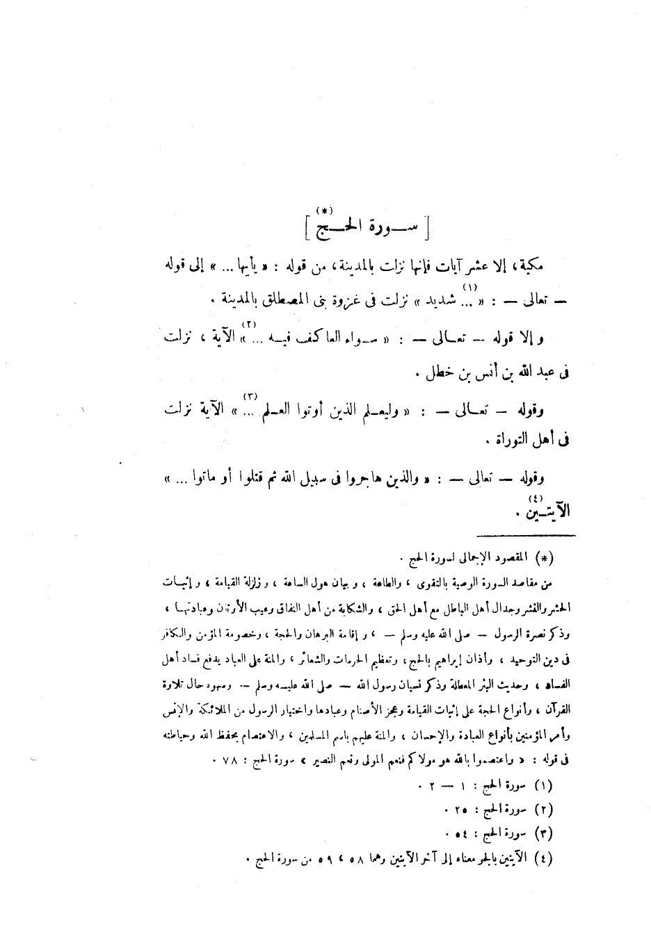 سورة الحج «1» مكية، إلا عشر آيات فإنها نزلت بالمدينة، من قوله: «يا أَيُّهَا ... » إلى قوله- تعالى-: «» «2» ... شَدِيدٌ»