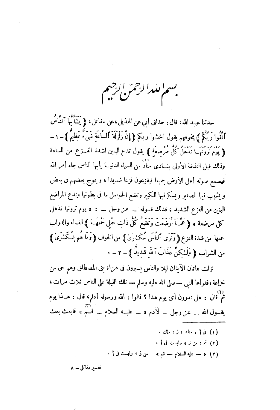 بِسْمِ اللَّهِ الرَّحْمنِ الرَّحِيمِ حدثنا عبيد اللَّهِ، قَالَ: حَدَّثَنِي أَبِي عَنِ الْهُذَيْلِ، عَنْ مقاتل، يا أَيُّهَا النَّاسُ اتَّقُوا رَبَّكُمْ يخوفهم يقول اخشوا ربكم إِنَّ زَلْزَلَةَ السَّاعَةِ شَيْءٌ عَظِيمٌ- 1- يَوْمَ تَرَوْنَها تَذْهَلُ كُلُّ مُرْضِعَةٍ