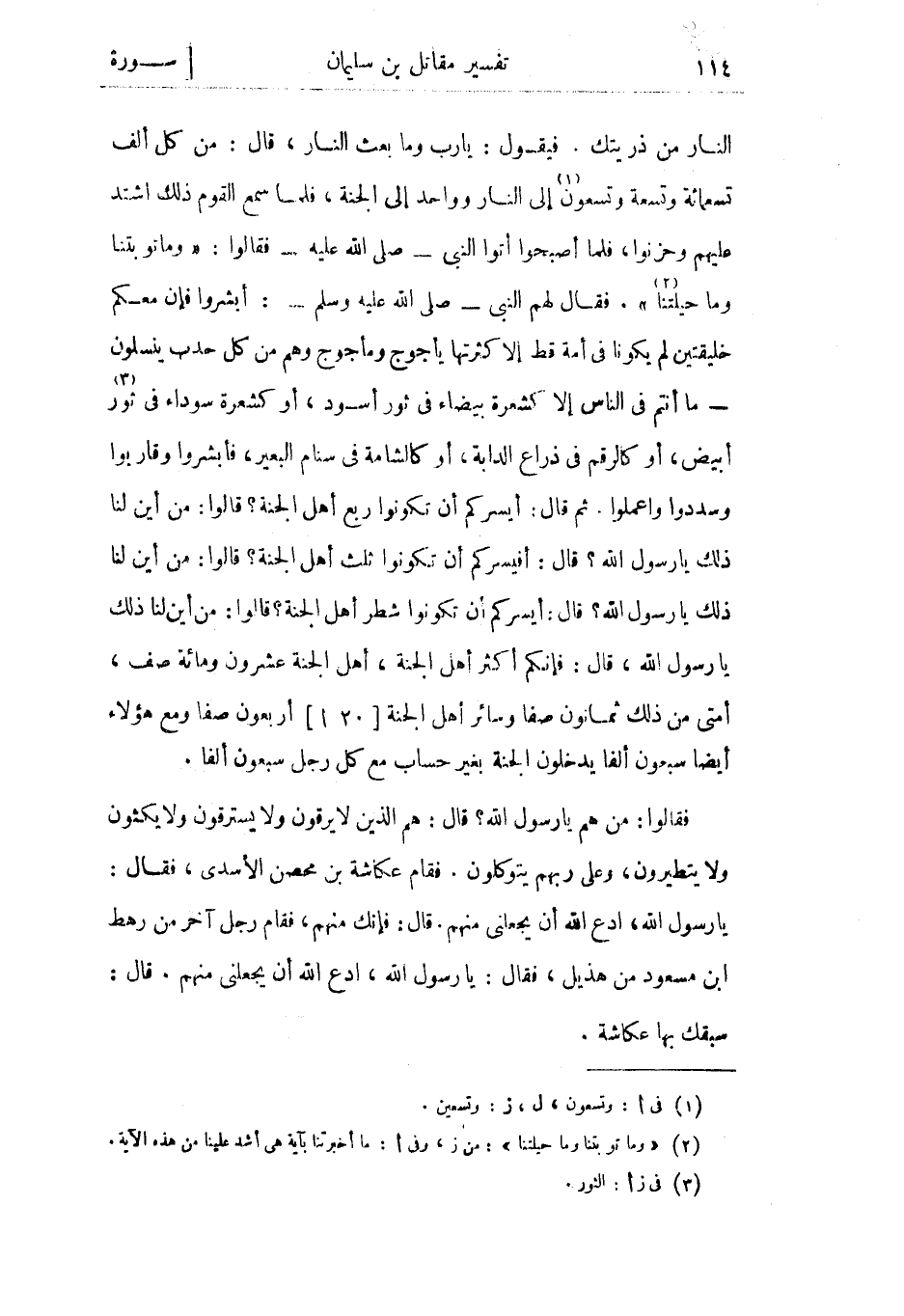 النار من ذريتك. فيقول: يا رب وما بعث النار، قال: من كل ألف تسعمائة وتسعة وتسعون «1» إلى النار وواحد إلى الجنة، فلما سمع القوم ذلك اشتد عليهم وحزنوا، فلما أصبحوا أتوا النبي- صلى الله عليه- فقالوا: «وما توبتنا وما حيلتنا «2» » . فقال لهم النبي- صلى الله عليه وسلم-: أبشروا فإن معكم خليقتين لم يكونا في أمة قط إلا كثرتها يأجوج ومأجوج وهم من كل حدب ينسلون- ما أنتم في الناس إلا كشعرة بيضاء في ثور أسود، أو كشعرة سوداء في ثور «3» أبيض، أو كالرقم في ذراع الدابة، أو كالشامة في سنام البعير، فأبشروا وقاربوا وسددوا واعملوا. ثم قال: أيسركم أن تكونوا ربع أهل الجنة؟ قالوا: من أين لنا ذلك يا رسول الله؟ قال: أفيسركم أن تكونوا ثلث أهل الجنة؟ قالوا: من أين لنا ذلك يا رسول الله؟ قال: أيسركم أن تكونوا شطر أهل الجنة؟ قالوا: من أين لنا ذلك يا رسول الله، قال: فإنكم أكثر أهل الجنة، أهل الجنة عشرون ومائة صف، أمتي من ذلك ثمانون صفا وسائر أهل الجنة [20 أ] أربعون صفا ومع هؤلاء أيضا سبعون ألفا يدخلون الجنة بغير حساب مع كل رجل سبعون ألفا.