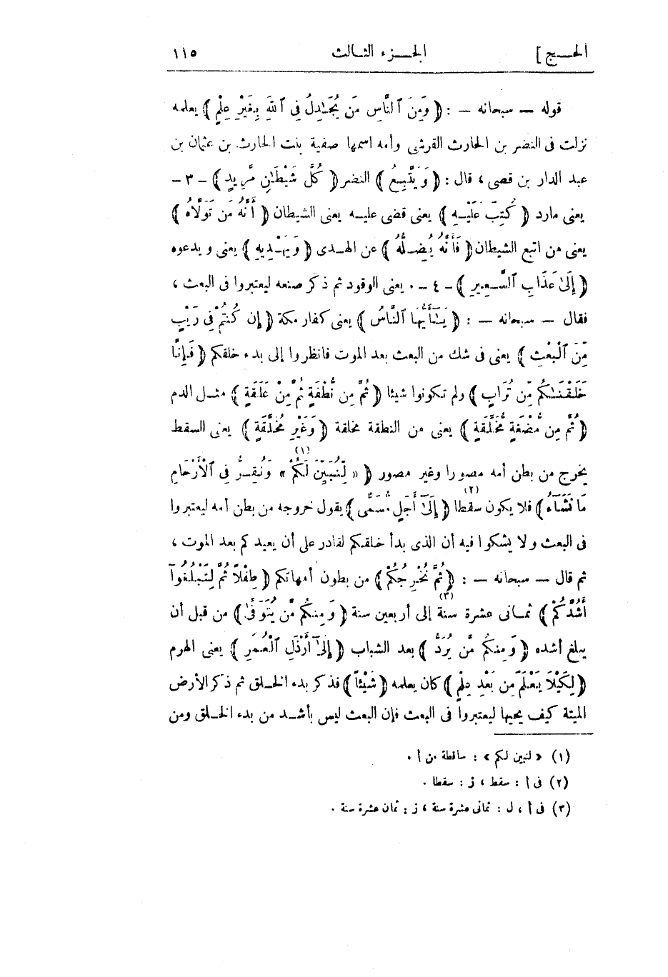 قوله- سبحانه-: وَمِنَ النَّاسِ مَنْ يُجادِلُ فِي اللَّهِ بِغَيْرِ عِلْمٍ يعلمه نزلت في النضر بن الحارث القرشي وأمه اسمها صفية بنت الحارث بن عثمان بن عبد الدار بن قصي، قال: وَيَتَّبِعُ النضر كُلَّ شَيْطانٍ مَرِيدٍ- 3- يعني مارد كُتِبَ عَلَيْهِ يعني قضي عليه يعنى الشيطان أَنَّهُ مَنْ تَوَلَّاهُ يعني من اتبع الشيطان فَأَنَّهُ يُضِلُّهُ عن الهدى وَيَهْدِيهِ يعنى ويدعون إِلى عَذابِ السَّعِيرِ- 4-. يعنى الوقود ثم ذكر صنعه ليعتبروا في البعث، فقال- سبحانه-: يا أَيُّهَا النَّاسُ يعني كفار مكة إِنْ كُنْتُمْ فِي رَيْبٍ مِنَ الْبَعْثِ يعني في شك من البعث بعد الموت فانظروا إلى بدء خلقكم فَإِنَّا خَلَقْناكُمْ مِنْ تُرابٍ ولم تكونوا شيئا ثُمَّ مِنْ نُطْفَةٍ ثُمَّ مِنْ عَلَقَةٍ مثل الدم ثُمَّ مِنْ مُضْغَةٍ مُخَلَّقَةٍ يعنى من النطفة مخلقة وَغَيْرِ مُخَلَّقَةٍ