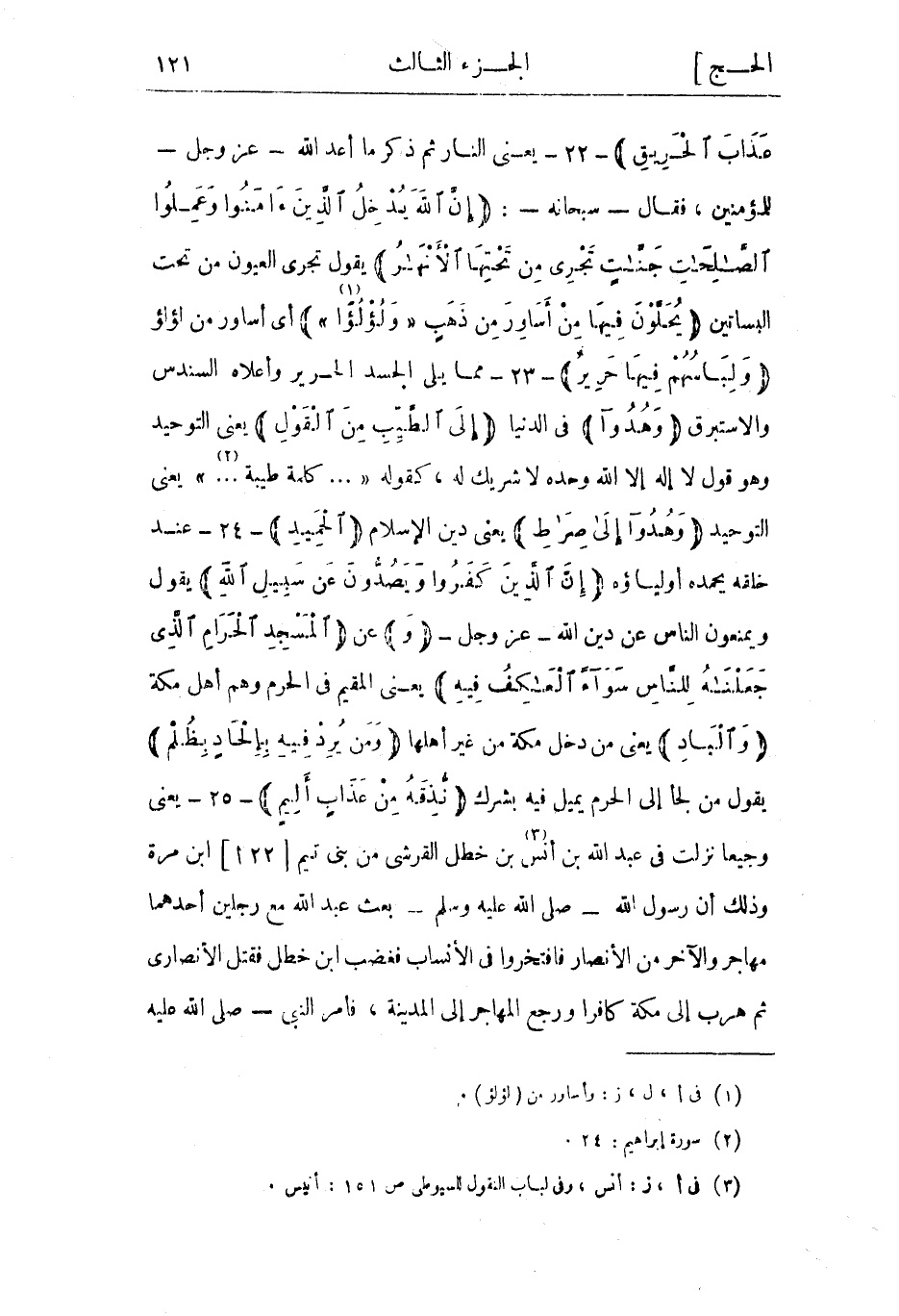 يعني النار ثم ذكر ما أعد الله- عز وجل- للمؤمنين، فقال- سبحانه-: إِنَّ اللَّهَ يُدْخِلُ الَّذِينَ آمَنُوا وَعَمِلُوا الصَّالِحاتِ جَنَّاتٍ تَجْرِي مِنْ تَحْتِهَا الْأَنْهارُ يقول تجري العيون من تحت البساتين يُحَلَّوْنَ فِيها مِنْ أَساوِرَ مِنْ ذَهَبٍ «وَلُؤْلُؤاً» «1» أي أساور من لؤلؤ وَلِباسُهُمْ فِيها حَرِيرٌ- 23- مما يلي الجسد الحرير وأعلاه السندس والإستبرق وَهُدُوا فى الدنيا إِلَى الطَّيِّبِ مِنَ الْقَوْلِ يعني التوحيد وهو قول لا إله إلا الله وحده لا شريك له، كقوله « ... كَلِمَةً طَيِّبَةً «2» ... » يعنى التوحيد وَهُدُوا إِلى صِراطِ يعنى دين الإسلام الْحَمِيدِ- 24- عند خلقه يحمده أولياؤه إِنَّ الَّذِينَ كَفَرُوا وَيَصُدُّونَ عَنْ سَبِيلِ اللَّهِ يقول ويمنعون الناس عن دين الله- عز وجل- وَعن الْمَسْجِدِ الْحَرامِ الَّذِي جَعَلْناهُ لِلنَّاسِ سَواءً الْعاكِفُ فِيهِ يعني المقيم في الحرم وهم أهل مكة وَالْبادِ يعني من دخل مكة من غير أهلها وَمَنْ يُرِدْ فِيهِ بِإِلْحادٍ بِظُلْمٍ يقول من لجأ إلى الحرم يميل فيه بشرك نُذِقْهُ مِنْ عَذابٍ أَلِيمٍ- 25- يعنى وجيعا نزلت في عبد الله بن أنس «3» بن خطل القرشي من بنى تيم [22 أ] ابن مرة وذلك أن رسول الله- صلى الله عليه وسلم- بعث عبد الله مع رجلين أحدهما مهاجر والآخر من الأنصار فافتخروا في الأنساب فغضب ابن خطل فقتل الأنصاري ثم هرب إلى مكة كافرا ورجع المهاجر إلى المدينة، فأمر النبي- صلى الله عليه