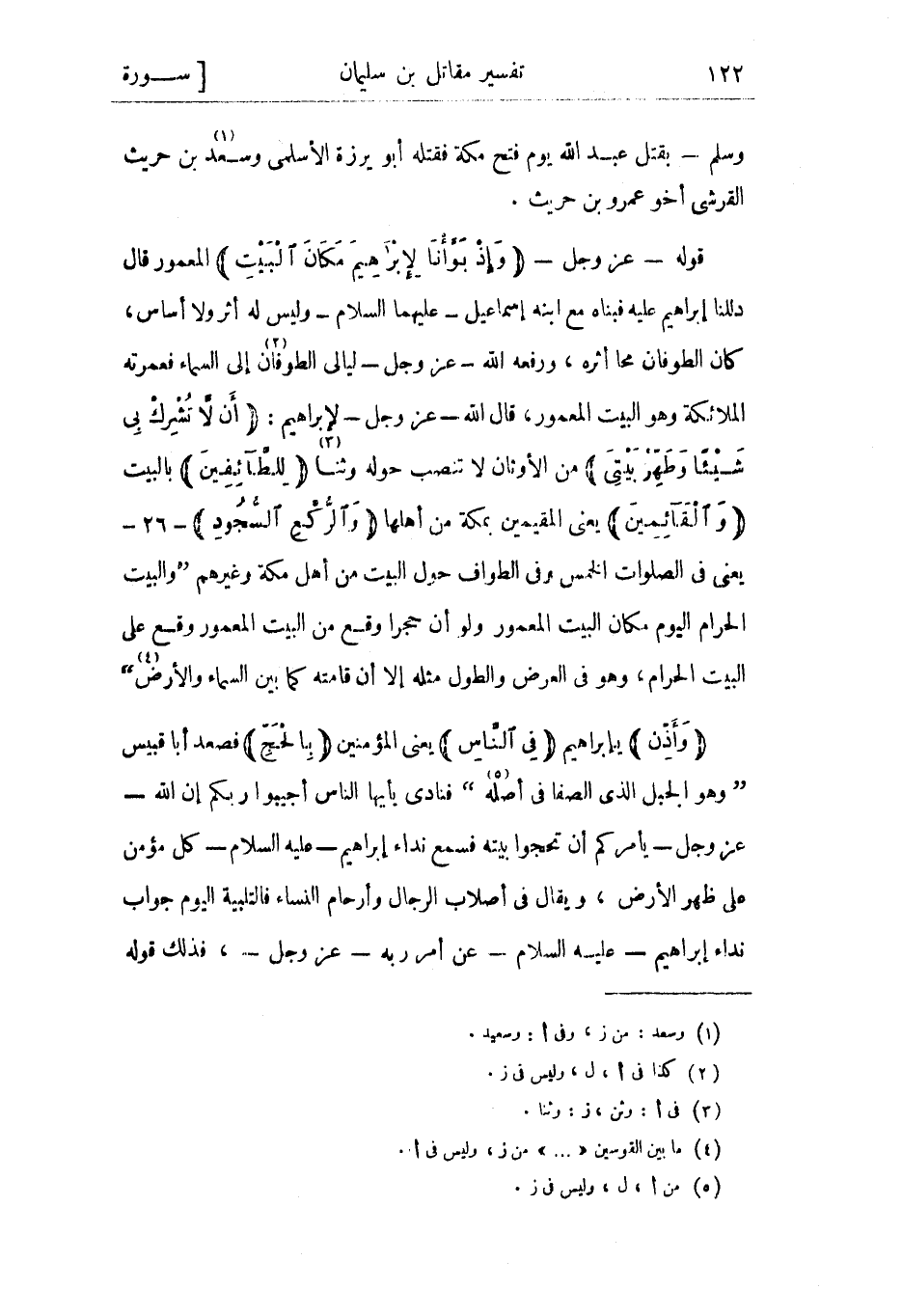 قوله- عز وجل- وَإِذْ بَوَّأْنا لِإِبْراهِيمَ مَكانَ الْبَيْتِ المعمور قال دللنا إبراهيم عليه فبناه مع ابنه إسماعيل- عليهما السلام- وليس له أثر ولا أساس، كان الطوفان محا أثره، ورفعه الله- عز وجل- ليالي الطوفان «2» إلى السماء فعمرته الملائكة وهو البيت المعمور، قال الله- عز وجل- لإبراهيم: أَنْ لا تُشْرِكْ بِي شَيْئاً وَطَهِّرْ بَيْتِيَ من الأوثان لا تنصب حوله وثنا «3» لِلطَّائِفِينَ بالبيت وَالْقائِمِينَ يعني المقيمين بمكة من أهلها وَالرُّكَّعِ السُّجُودِ- 26- يعني في الصلوات الخمس وفي الطواف حول البيت من أهل مكة وغيرهم والبيت الحرام اليوم مكان البيت المعمور ولو أن حجرا وقع من البيت المعمور وقع على البيت الحرام، وهو في العرض والطول مثله إلا أن قامته كما بين السماء والأرض «4» وَأَذِّنْ يإبراهيم فِي النَّاسِ يعنى المؤمنين بِالْحَجِّ فصعد أبا قبيس وهو الجبل الذي الصفا في أصله «5» فنادى يأيها الناس أجيبوا ربكم إن الله- عز وجل- يأمركم أن تحجوا بيته فسمع نداء إبراهيم- عليه السلام- كل مؤمن على ظهر الأرض، ويقال في أصلاب الرجال وأرحام النساء فالتلبية اليوم جواب نداء إبراهيم- عليه السلام- عن أمر ربه- عز وجل-، فذلك قوله