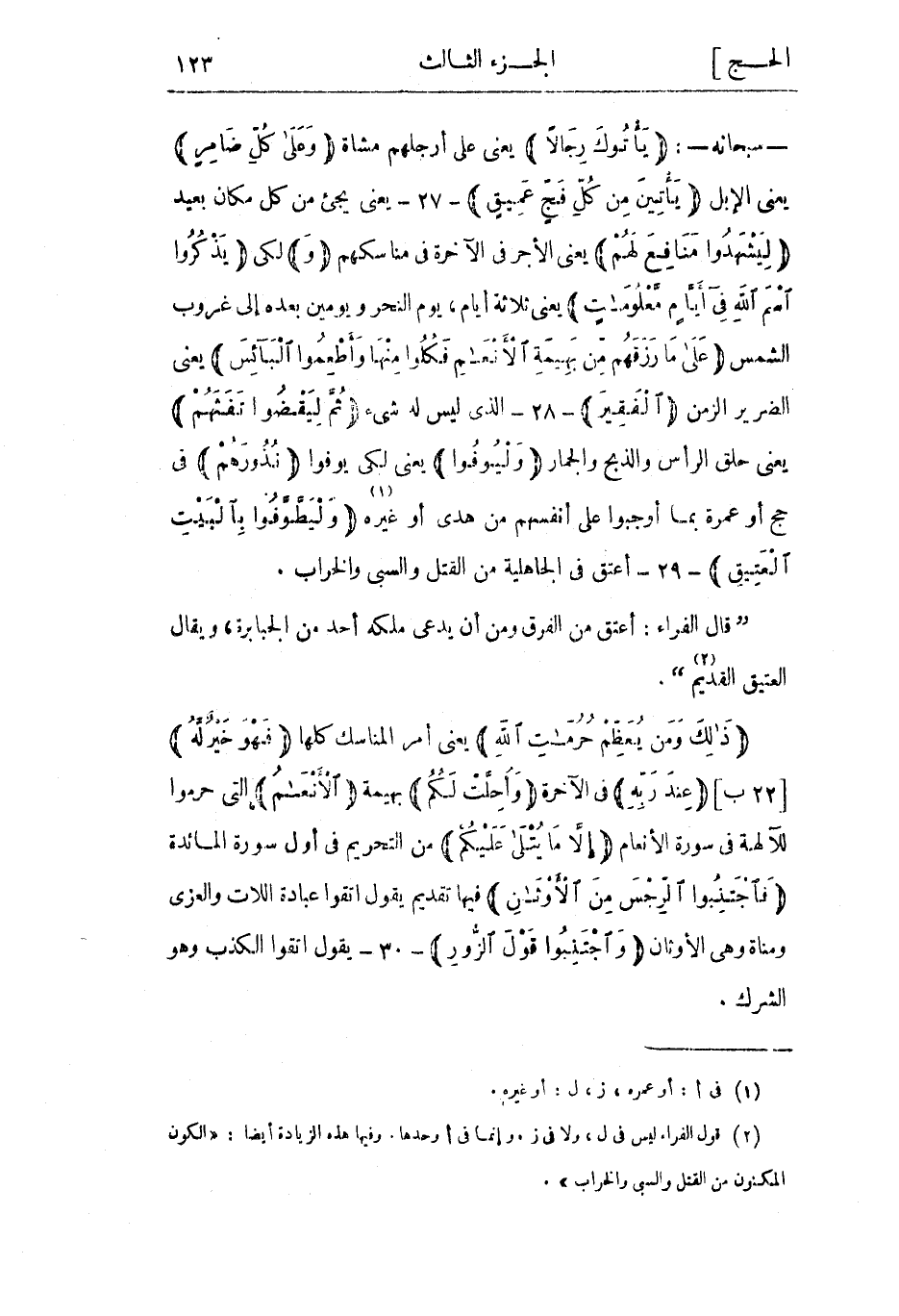 - سبحانه-: يَأْتُوكَ رِجالًا يعني على أرجلهم مشاة وَعَلى كُلِّ ضامِرٍ يعني الإبل يَأْتِينَ مِنْ كُلِّ فَجٍّ عَمِيقٍ- 27- يعني يجيء من كل مكان بعيد لِيَشْهَدُوا مَنافِعَ لَهُمْ يعني الأجر في الآخرة في مناسكهم وَلكي يَذْكُرُوا اسْمَ اللَّهِ فِي أَيَّامٍ مَعْلُوماتٍ يعني ثلاثة أيام، يوم النحر ويومين بعده إلى غروب الشمس عَلى مَا رَزَقَهُمْ مِنْ بَهِيمَةِ الْأَنْعامِ فَكُلُوا مِنْها وَأَطْعِمُوا الْبائِسَ يعنى الضرير الزمن الْفَقِيرَ- 28- الذي ليس له شيء ثُمَّ لْيَقْضُوا تَفَثَهُمْ يعنى حلق الرأس والذبح والجمار وَلْيُوفُوا يعنى لكي يوفوا نُذُورَهُمْ في حج أو عمرة بما أوجبوا على أنفسهم من هدي أو غيره «1» وَلْيَطَّوَّفُوا بِالْبَيْتِ الْعَتِيقِ- 29- أعتق في الجاهلية من القتل والسبي والخراب.