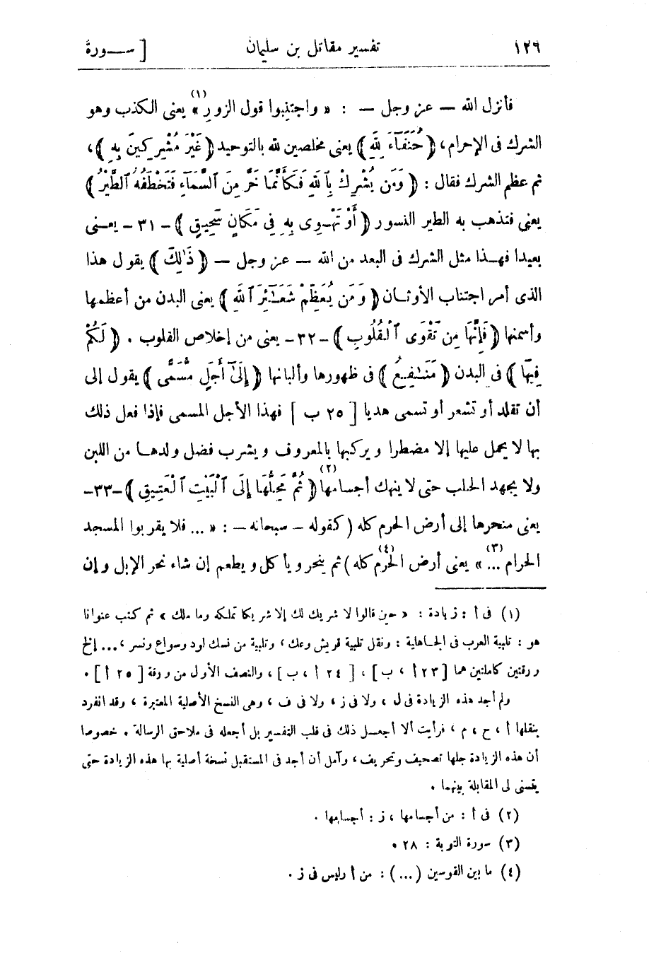 ولم أجد هذه الزيادة فى ل، ولا فى ز، ولا فى ف، وهي النسخ الأصلية المعتبرة، وقد انفرد بنقلها أ، ح، م، فرأيت ألا أجعل ذلك فى قلب التفسير بل أجعله فى ملاحق الرسالة. خصوصا أن هذه الزيادة جلها تصحيف وتحريف، وآمل أن أجد فى المستقبل نسخة أصلية بها هذه الزيادة حتى يتسنى لي المقابلة بينهما.