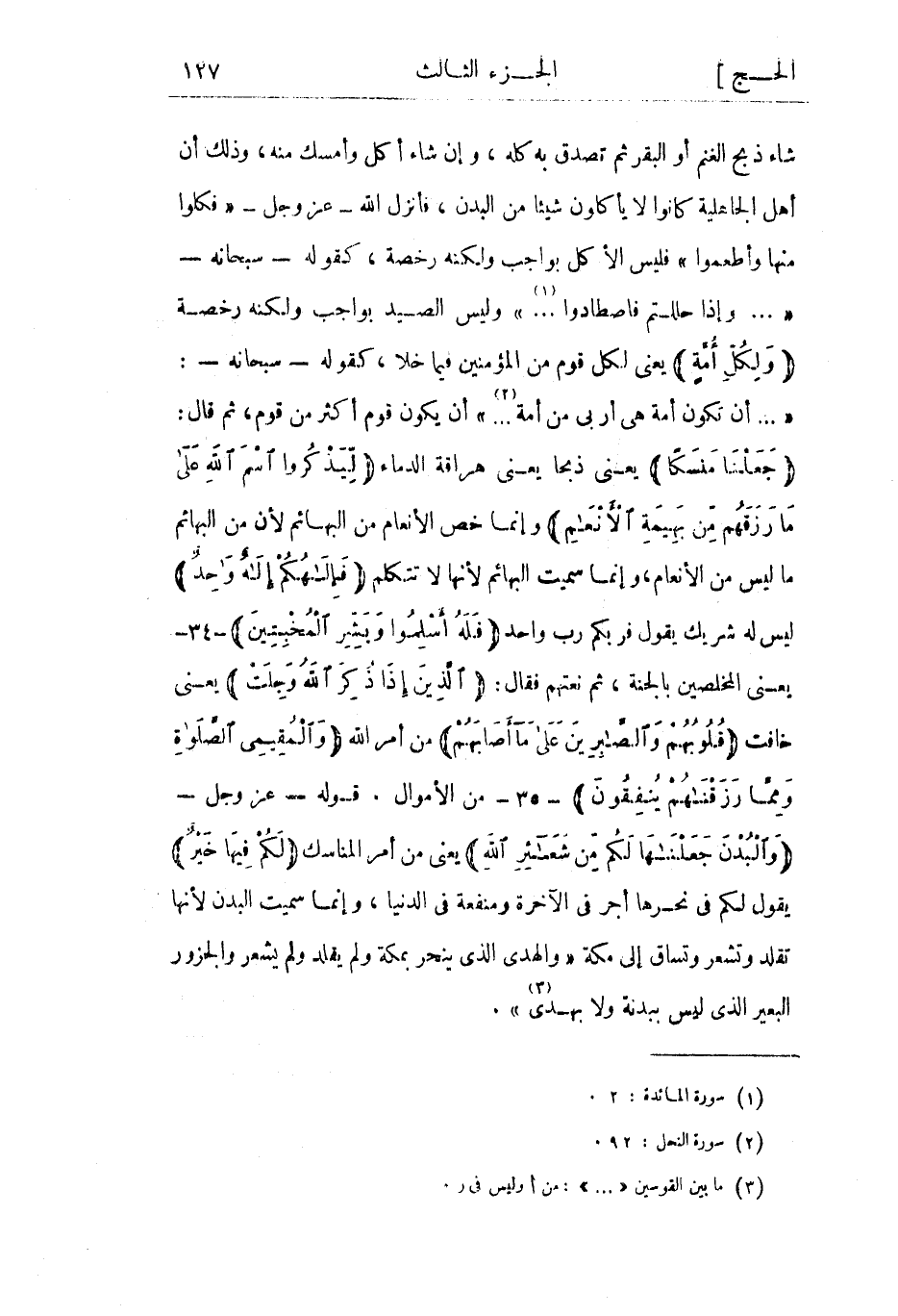 شاء ذبح الغنم أو البقر ثم تصدق به كله، وإن شاء أكل وأمسك منه، وذلك أن أهل الجاهلية كانوا لا يأكلون شيئا من البدن، فأنزل الله- عز وجل- «فَكُلُوا مِنْها وَأَطْعِمُوا» فليس الأكل بواجب ولكنه رخصة، كقوله- سبحانه- « ... وَإِذا حَلَلْتُمْ فَاصْطادُوا «1» ... » وليس الصيد بواجب ولكنه رخصة وَلِكُلِّ أُمَّةٍ يعني لكل قوم من المؤمنين فيما خلا، كقوله- سبحانه-: