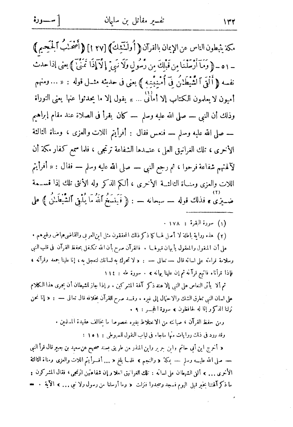 «أخرج ابن أبى حاتم وابن جرير وابن المنذر من طريق بسند صحيح عن سعيد بن جبير قال قرأ النبي- صلى الله عليه وسلم- بمكة «والنجم» فلما بلغ « ... أَفَرَأَيْتُمُ اللَّاتَ وَالْعُزَّى وَمَناةَ الثَّالِثَةَ الْأُخْرى ... » ألقى الشيطان على لسانه: تلك الغرانيق العلا وإن شفاعتهن لترتجى، فقال المشركون: