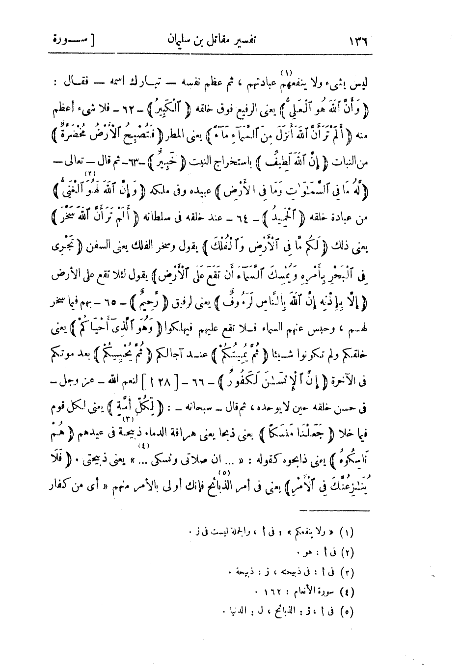 وَأَنَّ اللَّهَ هُوَ الْعَلِيُّ يعنى الرفيع فوق خلقه الْكَبِيرُ- 62- فلا شيء أعظم منه أَلَمْ تَرَ أَنَّ اللَّهَ أَنْزَلَ مِنَ السَّماءِ ماءً يعنى المطر فَتُصْبِحُ الْأَرْضُ مُخْضَرَّةً من النبات إِنَّ اللَّهَ لَطِيفٌ باستخراج النبت خَبِيرٌ- 63- ثم قال- تعالى- لَهُ ما فِي السَّماواتِ وَما فِي الْأَرْضِ عبيده وفي ملكه وَإِنَّ اللَّهَ لَهُوَ «2» الْغَنِيُّ من عبادة خلقه الْحَمِيدُ- 64- عند خلقه في سلطانه أَلَمْ تَرَ أَنَّ اللَّهَ سَخَّرَ يعنى ذلك لَكُمْ ما فِي الْأَرْضِ وَالْفُلْكَ يقول وسخر الفلك يعني السفن تَجْرِي فِي الْبَحْرِ بِأَمْرِهِ وَيُمْسِكُ السَّماءَ أَنْ تَقَعَ عَلَى الْأَرْضِ يقول لئلا تقع على الأرض إِلَّا بِإِذْنِهِ إِنَّ اللَّهَ بِالنَّاسِ لَرَؤُفٌ يعنى لرفيق رَحِيمٌ- 65- بهم فيما سخر لهم، وحبس عنهم السماء فلا تقع عليهم فيهلكوا وَهُوَ الَّذِي أَحْياكُمْ يعني خلقكم ولم تكونوا شيئا ثُمَّ يُمِيتُكُمْ عند آجالكم ثُمَّ يُحْيِيكُمْ بعد موتكم في الآخرة إِنَّ الْإِنْسانَ لَكَفُورٌ- 66-[28 أ] لنعم الله- عز وجل- في حسن خلقه حين لا يوحده، ثم قال- سبحانه-: لِكُلِّ أُمَّةٍ يعني لكل قوم فيما خلا جَعَلْنا مَنْسَكاً يعني ذبحا يعني هراقة الدماء ذبيحة «3» في عيدهم هُمْ ناسِكُوهُ يعنى ذابحوه كقوله: « ... إِنَّ صَلاتِي وَنُسُكِي ... » «4» يعنى ذبيحتي. فَلا يُنازِعُنَّكَ فِي الْأَمْرِ يعني في أمر الذبائح «5» فإنك أولى بالأمر منهم «أى من كفار