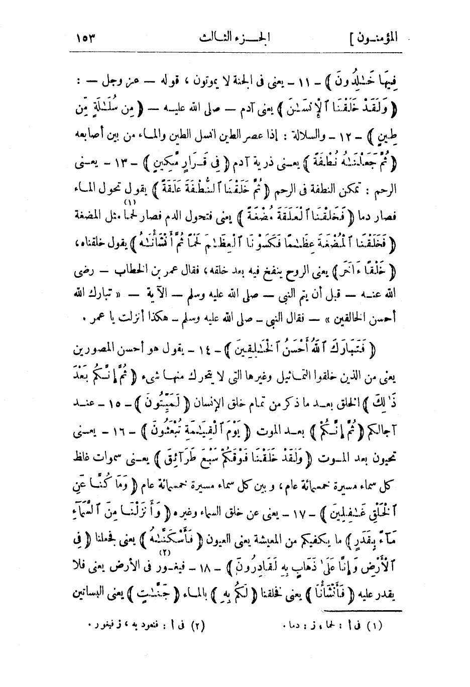 فقال عمر بن الخطاب- رضي الله عنه- قبل أن يتم النبي- صلى الله عليه وسلم- الآية- «فَتَبارَكَ اللَّهُ أَحْسَنُ الْخالِقِينَ» - فقال النبي- صلى الله عليه وسلم- هكذا أنزلت يا عمر.