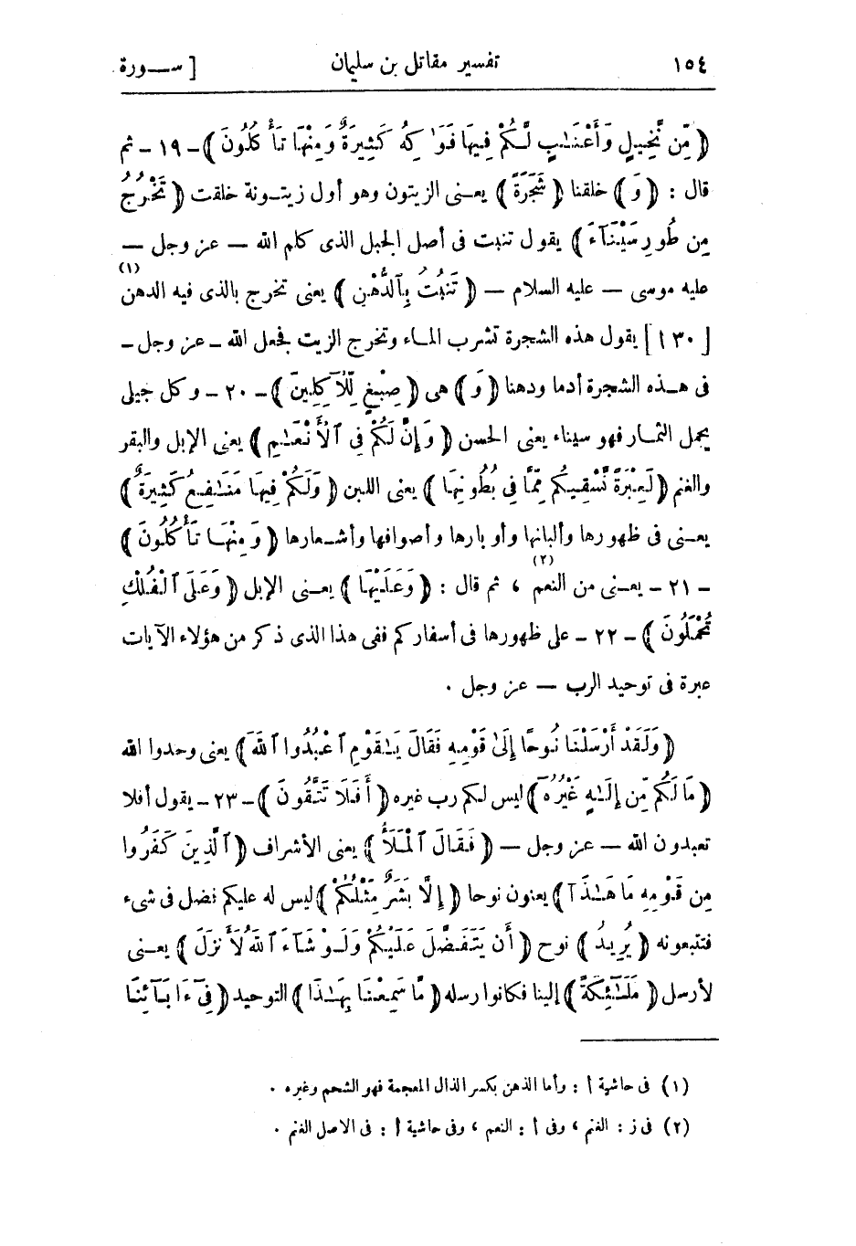 مِنْ نَخِيلٍ وَأَعْنابٍ لَكُمْ فِيها فَواكِهُ كَثِيرَةٌ وَمِنْها تَأْكُلُونَ- 19- ثم قال: وَخلقنا شَجَرَةً يعنى الزيتون وهو أول زيتونة خلقت تَخْرُجُ مِنْ طُورِ سَيْناءَ يقول تنبت في أصل الجبل الذي كلم الله- عز وجل- عليه موسى- عليه السلام- تَنْبُتُ بِالدُّهْنِ يعني تخرج بالذي فيه الدهن «1» [30 أ] يقول هذه الشجرة تشرب الماء وتخرج الزيت فجعل الله- عز وجل- في هذه الشجرة أدما ودهنا وَهي صِبْغٍ لِلْآكِلِينَ- 20- وكل جيلى يجمل الثمار فهو سيناء يعني الحسن وَإِنَّ لَكُمْ فِي الْأَنْعامِ يعني الإبل والبقر والغنم لَعِبْرَةً نُسْقِيكُمْ مِمَّا فِي بُطُونِها يعنى اللبن وَلَكُمْ فِيها مَنافِعُ كَثِيرَةٌ يعني في ظهورها وألبانها وأوبارها وأصوافها وأشعارها وَمِنْها تَأْكُلُونَ- 21- يعني من النعم «2» ، ثم قال: عَلَيْها
