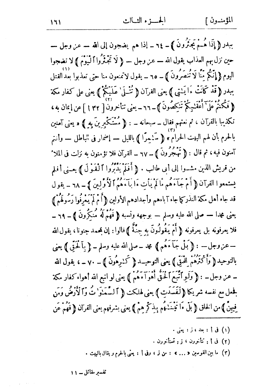 ببدر إِذا هُمْ يَجْأَرُونَ- 64- إذا هم يضجون إلى الله- عز وجل- حين نزل بهم العذاب يقول الله- عز وجل- لا تَجْأَرُوا الْيَوْمَ لا تضجوا اليوم إِنَّكُمْ مِنَّا لا تُنْصَرُونَ- 65- يقول لا تمنعون منا حتى تعذبوا بعد «1» القتل ببدر قَدْ كانَتْ آياتِي يعني القرآن تُتْلى عَلَيْكُمْ يعني على كفار مكة فَكُنْتُمْ عَلى أَعْقابِكُمْ تَنْكِصُونَ- 66- يعنى تتأخرون «2» [32 أ] عن إيمان به، تكذيبا بالقرآن، ثم نعتهم فقال- سبحانه-: مُسْتَكْبِرِينَ بِهِ «يعني آمنين بالحرم بأن لهم البيت الحرام» «3» سامِراً بالليل- إضمار في الباطل- وأنتم آمنون فيه، ثم قال: تَهْجُرُونَ- 67- القرآن فلا تؤمنون به نزلت في الملأ من قريش الذين مشوا إلى أبي طالب. أَفَلَمْ يَدَّبَّرُوا الْقَوْلَ يعني أفلم يستمعوا القرآن أَمْ جاءَهُمْ مَا لَمْ يَأْتِ آباءَهُمُ الْأَوَّلِينَ- 68- يقول قد جاء أهل مكة النذر كما جاء آباءهم وأجدادهم الأولين أَمْ لَمْ يَعْرِفُوا رَسُولَهُمْ يعني محمدا- صلى الله عليه وسلم- بوجهه ونسبه فَهُمْ لَهُ مُنْكِرُونَ- 69- فلا يعرفونه بل يعرفونه أَمْ يَقُولُونَ بِهِ جِنَّةٌ قالوا: إن بمحمد جنونا، يقول الله- عز وجل-: بَلْ جاءَهُمْ محمد- صلى الله عليه وسلم- بِالْحَقِّ يعني بالتوحيد وَأَكْثَرُهُمْ لِلْحَقِّ يعني التوحيد كارِهُونَ- 70-، يقول الله- عز وجل-: وَلَوِ اتَّبَعَ الْحَقُّ أَهْواءَهُمْ يعني لو اتبع الله أهواء كفار مكة فجعل مع نفسه شريكا لَفَسَدَتِ يعني لهلكت السَّماواتُ وَالْأَرْضُ وَمَنْ فِيهِنَّ من الخلق بَلْ أَتَيْناهُمْ بِذِكْرِهِمْ يعنى بشرفهم يعنى القرآن