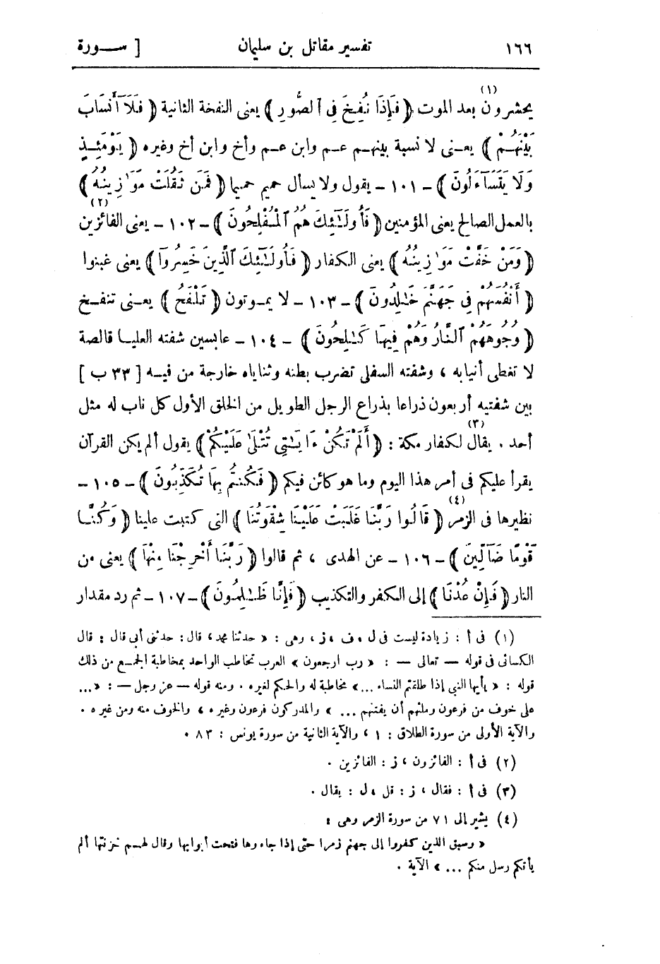 يحشرون «1» بعد الموت فَإِذا نُفِخَ فِي الصُّورِ يعنى النفخة الثانية فَلا أَنْسابَ بَيْنَهُمْ يعني لا نسبة بينهم عم وابن عم وأخ وابن أخ وغيره يَوْمَئِذٍ وَلا يَتَساءَلُونَ- 101- يقول ولا يسأل حميم حميما فَمَنْ ثَقُلَتْ مَوازِينُهُ بالعمل الصالح يعني المؤمنين فَأُولئِكَ هُمُ الْمُفْلِحُونَ- 102- يعنى الفائزين «2» وَمَنْ خَفَّتْ مَوازِينُهُ يعنى الكفار فَأُولئِكَ الَّذِينَ خَسِرُوا يعنى غبنوا أَنْفُسَهُمْ فِي جَهَنَّمَ خالِدُونَ- 103- لا يموتون تَلْفَحُ يعني تنفخ وُجُوهَهُمُ النَّارُ وَهُمْ فِيها كالِحُونَ- 104- عابسين شفته العليا قالصة لا تغطى أنيابه، وشفته السفلى تضرب بطنه وثناياه خارجة من فيه [33 ب] بين شفتيه أربعون ذراعا بذراع الرجل الطويل من الخلق الأول كل ناب له مثل أحد ويقال «3» لكفار مكة: أَلَمْ تَكُنْ آياتِي تُتْلى عَلَيْكُمْ يقول ألم يكن القرآن يقرأ عليكم في أمر هذا اليوم وما هو كائن فيكم فَكُنْتُمْ بِها تُكَذِّبُونَ- 105- نظيرها في الزمر «4» قالُوا رَبَّنا غَلَبَتْ عَلَيْنا شِقْوَتُنا التي كتبت علينا وَكُنَّا قَوْماً ضالِّينَ- 106- عن الهدى، ثم قالوا رَبَّنا أَخْرِجْنا مِنْها يعني من النار فَإِنْ عُدْنا إلى الكفر والتكذيب فَإِنَّا ظالِمُونَ- 107- ثم رد مقدار