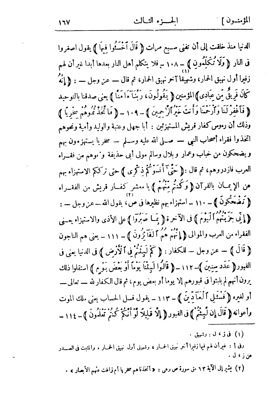 الدنيا منذ خلقت إلى أن تفنى سبع مرات قالَ اخْسَؤُا فِيها يقول اصغروا في النار وَلا تُكَلِّمُونِ- 108- فلا يتكلم أهل النار بعدها أبدا غير أن لهم زفيرا أول نهيق الحمار، وشهيقا «1» آخر نهيق الحمار، ثم قال- عز وجل-: إِنَّهُ كانَ فَرِيقٌ مِنْ عِبادِي المؤمنين يَقُولُونَ، رَبَّنا آمَنَّا يعني صدقنا بالتوحيد فَاغْفِرْ لَنا وَارْحَمْنا وَأَنْتَ خَيْرُ الرَّاحِمِينَ- 109- فَاتَّخَذْتُمُوهُمْ سِخْرِيًّا وذلك أن رءوس كفار قريش المستهزئين: أبا جهل وعتبة والوليد وأمية ونحوهم اتخذوا فقراء أصحاب النبي- صلى الله عليه وسلم- سخريا يستهزءون بهم ويضحكون من خباب وعمار وبلال وسالم مولى أبي حذيفة ونحوهم من فقراء العرب فازدروهم، ثم قال: حَتَّى أَنْسَوْكُمْ ذِكْرِي حتى ترككم الاستهزاء بهم عن الإيمان بالقرآن وَكُنْتُمْ مِنْهُمْ يا معشر كفار قريش من الفقراء تَضْحَكُونَ- 110- استهزاء بهم نظيرها في ص «2» ، يقول الله- عز وجل-:
