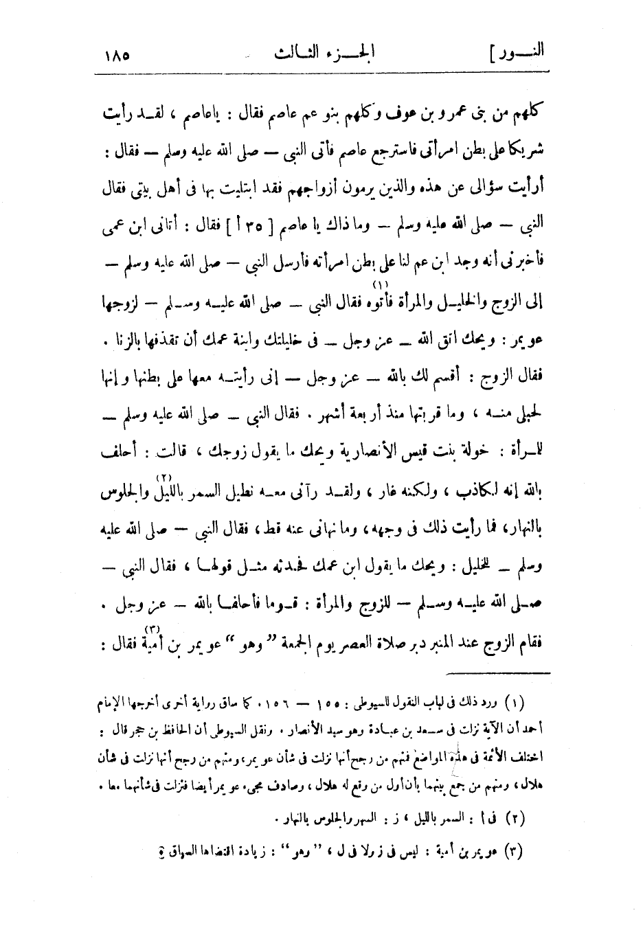 (1) ورد ذلك فى لباب النقول للسيوطي: 155- 156. كما ساق رواية أخرى أخرجها الإمام أحمد أن الآية نزلت فى سعد بن عبادة وهو سيد الأنصار. ونقل السيوطي أن الحافظ بن حجر قال: