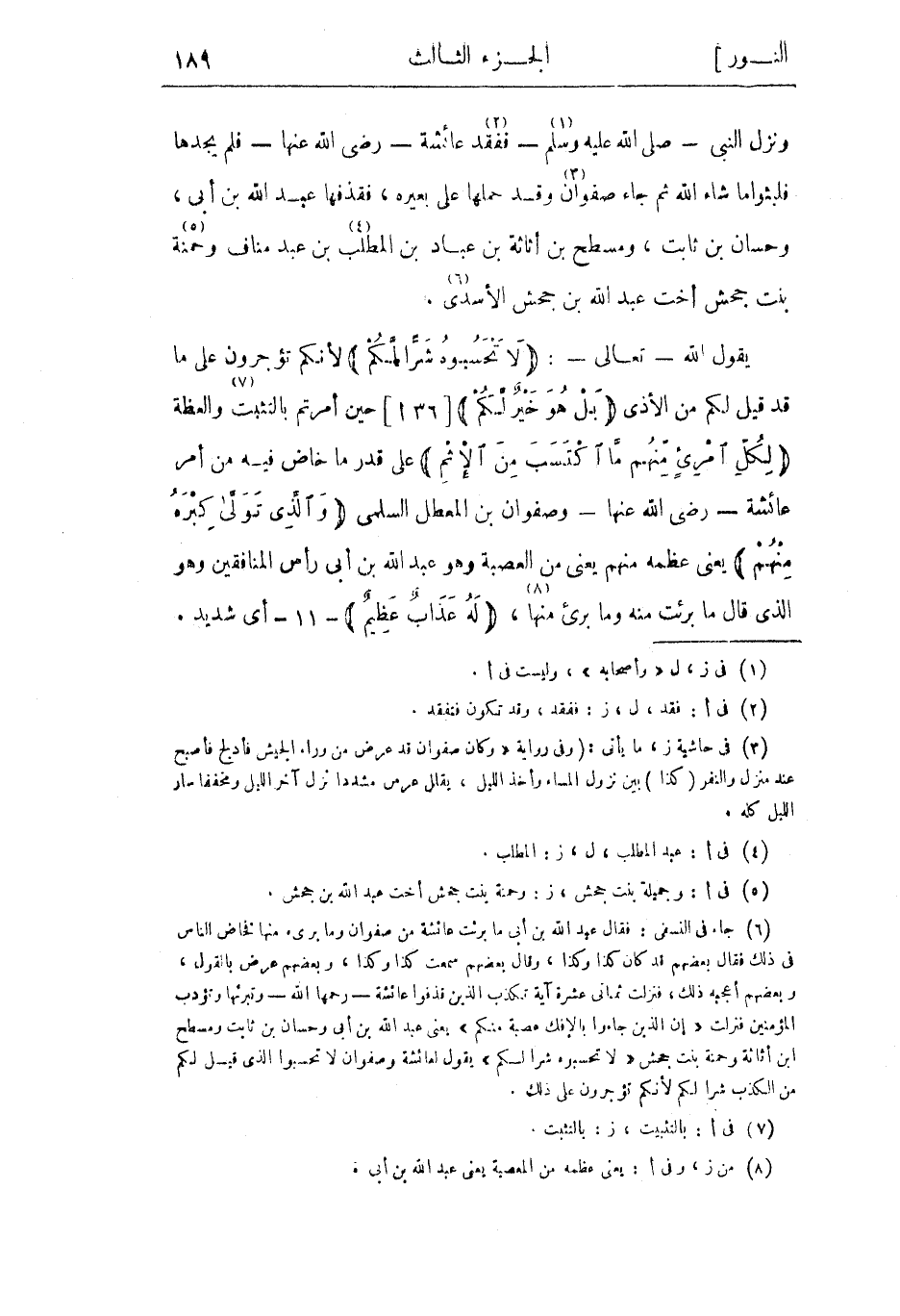 (6) جاء فى النسفي: فقال عبد الله بن أبى ما برئت عائشة من صفوان وما برىء منها فخاض الناس فى ذلك فقال بعضهم قد كان كذا وكذا، وقال بعضهم سمعت كذا وكذا، وبعضهم عرض بالقول، وبعضهم أعجبه ذلك، فنزلت ثماني عشرة آية تكذب الذين قذفوا عائشة- رحمها الله- وتبرئها وتؤدب المؤمنين فنزلت «إِنَّ الَّذِينَ جاؤُ بِالْإِفْكِ عُصْبَةٌ مِنْكُمْ» يعنى عبد الله بن أبى وحسان بن ثابت ومسطح ابن أثاثة وحمنة بنت جحش «لا تَحْسَبُوهُ شَرًّا لَكُمْ» يقول لعائشة وصفوان لا تحسبوا الذي قيل لكم من الكذب شرا لكم لأنكم تؤجرون على ذلك.