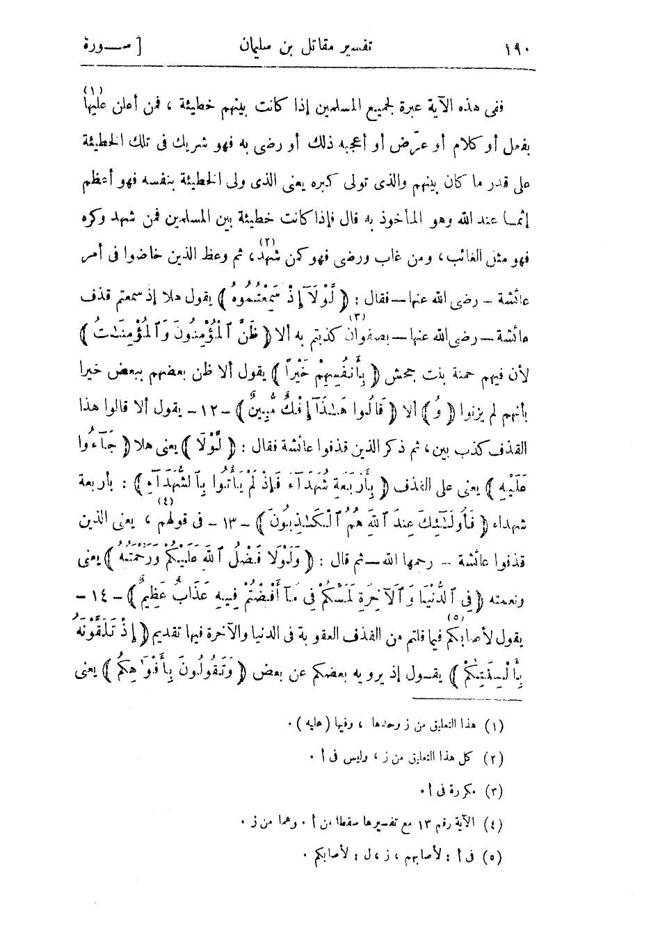 ففي هذه الآية عبرة لجميع المسلمين إذا كانت بينهم خطيئة، فمن أعلن عليها «1» بفعل أو كلام أو عرض أو أعجبه ذلك أو رضي به فهو شريك في تلك الخطيئة على قدر ما كان بينهم والذي تولى كبره يعني الذي ولي الخطيئة بنفسه فهو أعظم إثما عند الله وهو المأخوذ به قال فإذا كانت خطيئة بين المسلمين فمن شهد وكره فهو مثل الغائب، ومن غاب ورضي فهو كمن شهد «2» ، ثم وعظ الذين خاضوا في أمر عائشة- رضي الله عنها- فقال: لَوْلا إِذْ سَمِعْتُمُوهُ يقول هلا إذ سمعتم قذف عائشة- رضي الله عنها- بصفوان «3» كذبتم به ألا ظَنَّ الْمُؤْمِنُونَ وَالْمُؤْمِناتُ لأن فيهم حمنة بنت جحش بِأَنْفُسِهِمْ خَيْراً يقول ألا ظن بعضهم ببعض خيرا بأنهم لم يزنوا وَألا قالُوا هذا إِفْكٌ مُبِينٌ- 12- يقول ألا قالوا هذا القذف كذب بين، ثم ذكر الذين قذفوا عائشة فقال: لَوْلا يعنى هلا جاؤُ عَلَيْهِ يعني على القذف بِأَرْبَعَةِ شُهَداءَ فَإِذْ لَمْ يَأْتُوا بِالشُّهَداءِ: بأربعة شهداء فَأُولئِكَ عِنْدَ اللَّهِ هُمُ الْكاذِبُونَ- 13- في قولهم «4» ، يعني الذين قذفوا عائشة- رحمها الله- ثم قال: وَلَوْلا فَضْلُ اللَّهِ عَلَيْكُمْ وَرَحْمَتُهُ يعنى ونعمته فِي الدُّنْيا وَالْآخِرَةِ لَمَسَّكُمْ فِيما أَفَضْتُمْ فِيهِ عَذابٌ عَظِيمٌ- 14- يقول لأصابكم «5» فيما قلتم من القذف العقوبة في الدنيا والآخرة فيها تقديم إِذْ تَلَقَّوْنَهُ بِأَلْسِنَتِكُمْ يقول إذ يرويه بعضكم عن بعض وَتَقُولُونَ بِأَفْواهِكُمْ يعنى