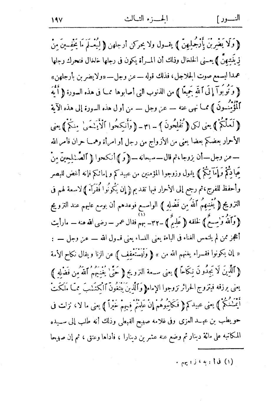 وَلا يَضْرِبْنَ بِأَرْجُلِهِنَّ يقول ولا يحركن أرجلهن لِيُعْلَمَ مَا يُخْفِينَ مِنْ زِينَتِهِنَّ يعني الخلخال وذلك أن المرأة يكون في رجلها خلخال فتحرك رجلها عمدا ليسمع صوت الجلاجل، فذلك قوله- عز وجل- «وَلا يَضْرِبْنَ بأرجلهن» وَتُوبُوا إِلَى اللَّهِ جَمِيعاً من الذنوب التي أصابوها مما في هذه السورة أَيُّهَا الْمُؤْمِنُونَ مما نهى عنه- عز وجل- من أول هذه السورة إلى هذه الآية لَعَلَّكُمْ يعني لكي تُفْلِحُونَ- 31- وَأَنْكِحُوا الْأَيامى مِنْكُمْ يعني الأحرار بعضكم بعضا يعني من الأزواج من رجل أو امرأة وهما حران فأمر الله- عز وجل- أن يزوجا، ثم قال- سبحانه- وَأنكحوا الصَّالِحِينَ مِنْ عِبادِكُمْ وَإِمائِكُمْ يقول وزوجوا المؤمنين من عبيدكم وإمائكم فإنه أغض للبصر وأحفظ للفرج، ثم رجع إلى الأحرار فيها تقديم إِنْ يَكُونُوا فُقَراءَ لا سعة لهم في التزويج يُغْنِهِمُ اللَّهُ مِنْ فَضْلِهِ الواسع فوعدهم أن يوسع عليهم عند التزويج وَاللَّهُ واسِعٌ لخلقه عَلِيمٌ- 32- بهم «1» فقال عمر- رضي الله عنه- ما رأيت أعجز ممن لم يلتمس الغناء في الباءة يعني النساء يعني قول الله- عز وجل-: