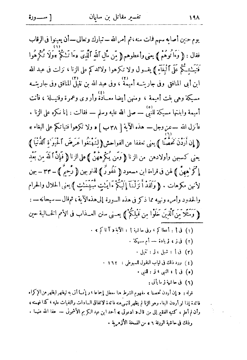 يوم حنين أصابه سهم فمات منه، ثم أمر الله- تبارك وتعالى- أن يعينوا في الرقاب فقال: وَآتُوهُمْ يعني وأعطوهم مِنْ مالِ اللَّهِ الَّذِي «آتاكُمْ» «1» وَلا تُكْرِهُوا فَتَياتِكُمْ عَلَى الْبِغاءِ يقول ولا تكرهوا ولائدكم على الزنا، نزلت فى عبد الله ابن أبي المنافق وفي جاريته أميمة «2» ، وفي عبد الله بن نتيل «3» المنافق وفي جاريته مسيكة وهي بنت أميمة، ومنهن أيضا معادة «4» وأروى وعمرة وقتيلة، فأتت أميمة وابنتها مسيكة للنبي «5» - صلى الله عليه وسلم- فقالت: إنا نكره على الزنا.