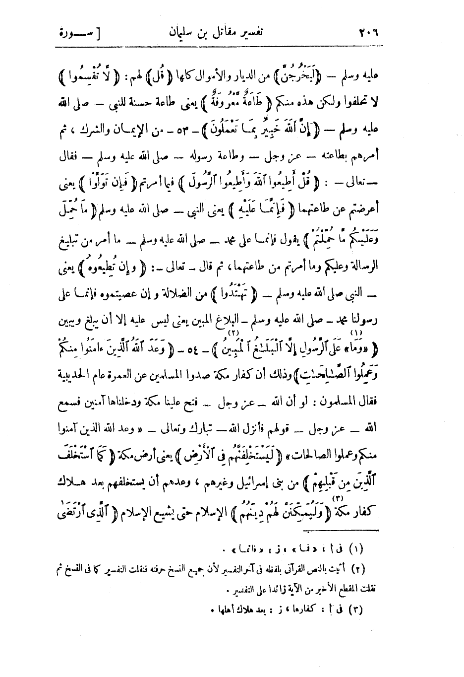 (2) أتيت بالنص القرآنى بلفظه فى آخر التفسير لأن جميع النسخ حرفته فنقلت التفسير كما فى النسخ ثم نقلت المقطع الأخير من الآية زائدا على التفسير.