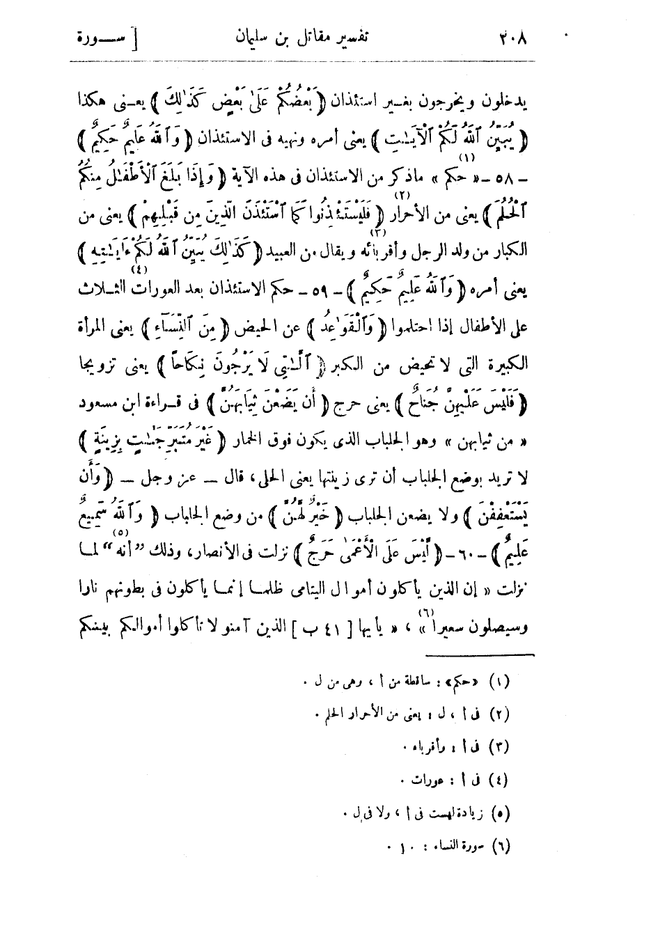 يدخلون ويخرجون بغير استئذان بَعْضُكُمْ عَلى بَعْضٍ كَذلِكَ يعني هكذا يُبَيِّنُ اللَّهُ لَكُمُ الْآياتِ يعني أمره ونهيه في الاستئذان وَاللَّهُ عَلِيمٌ حَكِيمٌ- 58- «حكم» «1» ما ذكر من الاستئذان في هذه الآية وَإِذا بَلَغَ الْأَطْفالُ مِنْكُمُ الْحُلُمَ يعني من الأحرار «2» فَلْيَسْتَأْذِنُوا كَمَا اسْتَأْذَنَ الَّذِينَ مِنْ قَبْلِهِمْ يعني من الكبار من ولد الرجل وأقربائه «3» ويقال من العبيد كَذلِكَ يُبَيِّنُ اللَّهُ لَكُمْ آياتِهِ يعني أمره وَاللَّهُ عَلِيمٌ حَكِيمٌ- 59- حكم الاستئذان بعد العورات «4» الثلاث على الأطفال إذا احتلموا وَالْقَواعِدُ عن الحيض مِنَ النِّساءِ يعني المرأة الكبيرة التي لا تحيض من الكبر اللَّاتِي لا يَرْجُونَ نِكاحاً يعنى تزويجا فَلَيْسَ عَلَيْهِنَّ جُناحٌ يعنى حرج أَنْ يَضَعْنَ ثِيابَهُنَّ في قراءة ابن مسعود «من ثيابهن» وهو الجلباب الذي يكون فوق الخمار غَيْرَ مُتَبَرِّجاتٍ بِزِينَةٍ لا تريد بوضع الجلباب أن تُرِيَ زينتها يعني الحلي، قال- عز وجل- وَأَنْ يَسْتَعْفِفْنَ ولا يضعن الجلباب خَيْرٌ لَهُنَّ من وضع الجلباب وَاللَّهُ سَمِيعٌ عَلِيمٌ- 60- لَيْسَ عَلَى الْأَعْمى حَرَجٌ نزلت في الأنصار، وذلك أنه «5» لما نزلت إِنَّ الَّذِينَ يَأْكُلُونَ أَمْوالَ الْيَتامى ظُلْماً إِنَّما يَأْكُلُونَ فِي بُطُونِهِمْ نَارًا وَسَيَصْلَوْنَ سَعِيراً «6» ، «يا أَيُّهَا الَّذِينَ آمَنُوا لا تَأْكُلُوا أَمْوالَكُمْ بَيْنَكُمْ [41 ب]