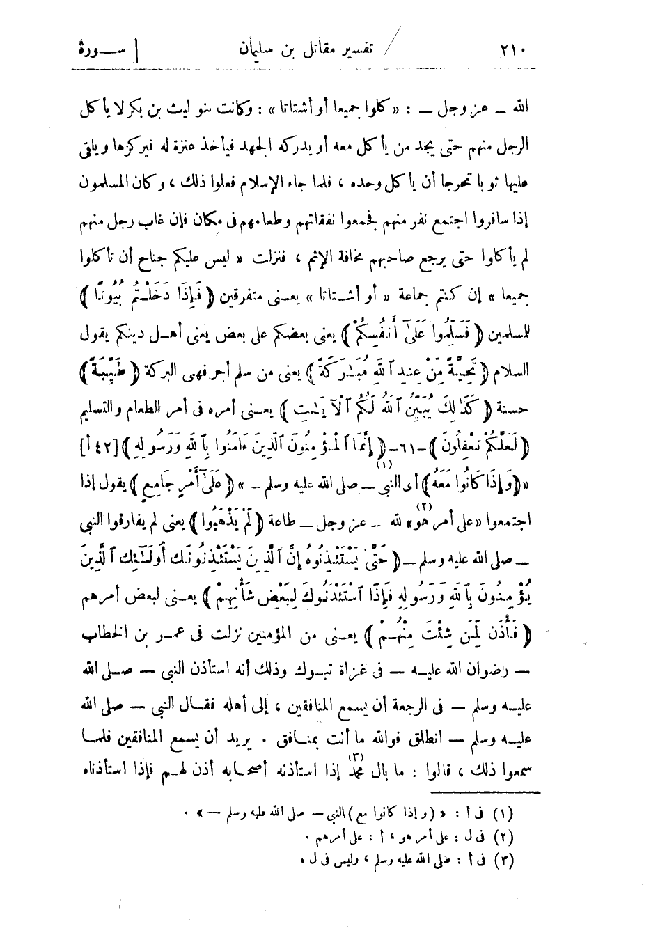 الله- عز وجل-: «كلوا جميعا أو أشتاتا» : وكانت بنو ليث بن بكر لا يأكل الرجل منهم حتى يجد من يأكل معه أو يدركه الجهد فيأخذ عنزة له فيركزها ويلقي عليها ثوبا تحرجا أن يأكل وحده، فلما جاء الإسلام فعلوا ذلك، وكان المسلمون إذا سافروا اجتمع نفر منهم فجمعوا نفقاتهم وطعامهم في مكان فإن غاب رجل منهم لم يأكلوا حتى يرجع صاحبهم مخافة الإثم، فنزلت «لَيْسَ عَلَيْكُمْ جُنَاحٌ أَنْ تَأْكُلُوا جَمِيعًا» إن كنتم جماعة «أَوْ أَشْتَاتًا» يعني متفرقين فَإِذا دَخَلْتُمْ بُيُوتاً للمسلمين فَسَلِّمُوا عَلى أَنْفُسِكُمْ يعني بعضكم على بعض يعني أهل دينكم يقول السلام تَحِيَّةً مِنْ عِنْدِ اللَّهِ مُبارَكَةً يعني من سلم أجر فهي البركة طَيِّبَةً حسنة كَذلِكَ يُبَيِّنُ اللَّهُ لَكُمُ الْآياتِ يعني أمره في أمر الطعام والتسليم لَعَلَّكُمْ تَعْقِلُونَ- 61- إِنَّمَا الْمُؤْمِنُونَ الَّذِينَ آمَنُوا بِاللَّهِ وَرَسُولِهِ [42 أ] وَإِذا كانُوا مَعَهُ أي النبي «1» - صلى الله عليه وسلم-» عَلى أَمْرٍ جامِعٍ يقول إذا اجتمعوا «على أمر هو «2» » لله- عز وجل- طاعة لَمْ يَذْهَبُوا يعني لم يفارقوا النبي- صلى الله عليه وسلم- حَتَّى يَسْتَأْذِنُوهُ إِنَّ الَّذِينَ يَسْتَأْذِنُونَكَ أُولئِكَ الَّذِينَ يُؤْمِنُونَ بِاللَّهِ وَرَسُولِهِ فَإِذَا اسْتَأْذَنُوكَ لِبَعْضِ شَأْنِهِمْ يعني لبعض أمرهم فَأْذَنْ لِمَنْ شِئْتَ مِنْهُمْ يعني من المؤمنين نزلت في عمر بن الخطاب- رضوان الله عليه- في غزاة تبوك وذلك