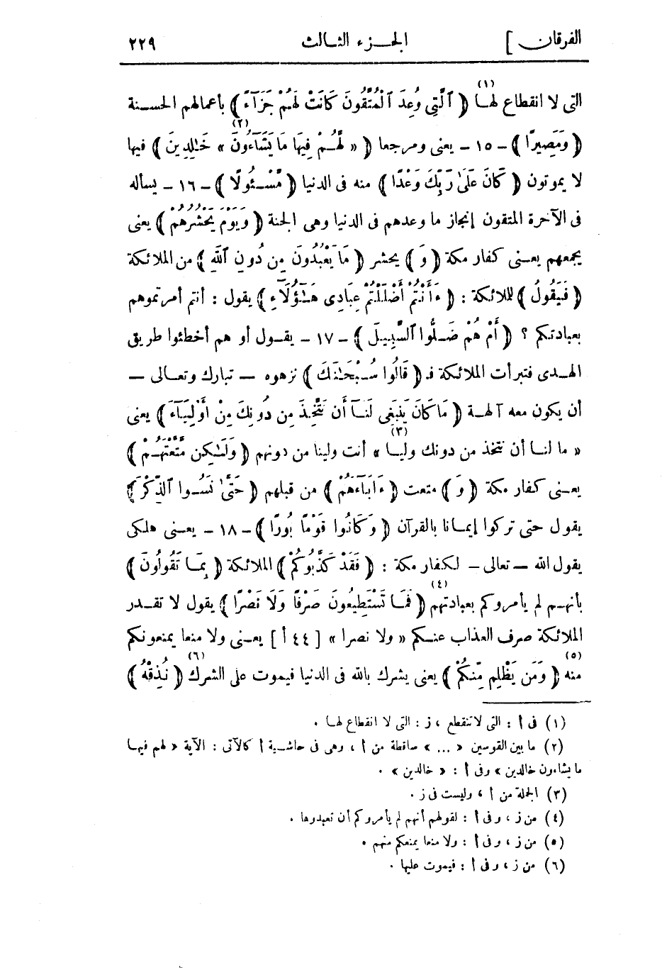 التي لا انقطاع لها «1» الَّتِي وُعِدَ الْمُتَّقُونَ كانَتْ لَهُمْ جَزاءً بأعمالهم الحسنة وَمَصِيراً- 15- يعني ومرجعا «لَهُمْ فِيها ما يَشاؤُنَ» «2» خالِدِينَ فيها لا يموتون كانَ عَلى رَبِّكَ وَعْداً منه فى الدنيا مَسْؤُلًا- 16- يسأله في الآخرة المتقون إنجاز ما وعدهم في الدنيا وهي الجنة وَيَوْمَ يَحْشُرُهُمْ يعني يجمعهم يعنى كفار مكة وَيحشر ما يَعْبُدُونَ مِنْ دُونِ اللَّهِ من الملائكة فَيَقُولُ للملائكة: أَأَنْتُمْ أَضْلَلْتُمْ عِبادِي هؤُلاءِ يقول: أنتم أمرتموهم بعبادتكم؟ أَمْ هُمْ ضَلُّوا السَّبِيلَ- 17- يقول أو هم أخطئوا طريق الهدى فتبرأت الملائكة ف قالُوا سُبْحانَكَ نزهوه- تبارك وتعالى- أن يكون معه آلهة مَا كانَ يَنْبَغِي لَنا أَنْ نَتَّخِذَ مِنْ دُونِكَ مِنْ أَوْلِياءَ يعني «ما لنا أن نتخذ من دونك وليا «3» » أنت ولينا من دونهم وَلكِنْ مَتَّعْتَهُمْ يعنى كفار مكة وَمتعت آباءَهُمْ من قبلهم حَتَّى نَسُوا الذِّكْرَ يقول حتى تركوا إيمانا بالقرآن وَكانُوا قَوْماً بُوراً- 18- يعني هلكى يقول الله- تعالى- لكفار مكة: فَقَدْ كَذَّبُوكُمْ الملائكة بِما تَقُولُونَ بأنهم لم يأمروكم بعبادتهم «4» فَما تَسْتَطِيعُونَ صَرْفاً وَلا نَصْراً يقول لا تقدر الملائكة صرف العذاب عنكم «ولا نصرا» [44 أ] يعني ولا منعا يمنعونكم منه «5» وَمَنْ يَظْلِمْ مِنْكُمْ يعني يشرك بالله في الدنيا فيموت على الشرك «6» نُذِقْهُ