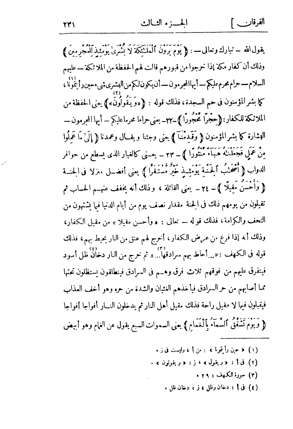يقول الله- تبارك وتعالى-: يَوْمَ يَرَوْنَ الْمَلائِكَةَ لا بُشْرى يَوْمَئِذٍ لِلْمُجْرِمِينَ وذلك أن كفار مكة إذا خرجوا من قبورهم قالت لهم الحفظة من الملائكة- عليهم السلام- حرام محرم عليكم- أيها المجرمون- أن يكون لكم من البشرى شيء حين رأيتمونا «1» ، كما بُشِّرَ المؤمنون في حم السجدة، فذلك قوله: «وَيَقُولُونَ» «2» يعني الحفظة من الملائكة للكفار: حِجْراً مَحْجُوراً- 22- يعني حراما محرما عليكم- أيها المجرمون- البشارة كما بشر المؤمنون وَقَدِمْنا يعني وجئنا ويقال وعمدنا إِلى مَا عَمِلُوا مِنْ عَمَلٍ فَجَعَلْناهُ هَباءً مَنْثُوراً- 23- يعني كالغبار الذي يسطع من حوافر الدواب أَصْحابُ الْجَنَّةِ يَوْمَئِذٍ خَيْرٌ مُسْتَقَرًّا يعني أفضل منزلا في الجنة وَأَحْسَنُ مَقِيلًا- 24- يعني القائلة، وذلك أنه يخفف عنهم الحساب ثم تقيلون من يومهم ذلك في الجنة مقدار نصف يوم من أيام الدنيا فيما يشتهون من التحف والكرامة، فذلك قوله- تعالى: «وَأَحْسَنُ مَقِيلا» من مقبل الكفار، وذلك أنه إذا فرغ من عرض الكفار، أخرج لهم عنق من النار يحيط بهم، فذلك قوله في الكهف: « ... أَحاطَ بِهِمْ سُرادِقُها «3» ... » ثم خرج من النار دخان «4» ظل أسود فيتفرق عليهم من فوقهم ثلاث فرق وهم في السرادق فينطلقون يستظلون تحتها مما أصابهم من حر السرادق فيأخذهم الغثيان والشدة من حره وهو أخف العذاب فيقبلون فيها لا مقبل راحة فذلك مقيل أهل النار ثم يدخلون النار أفواجا أفواجا وَيَوْمَ تَشَقَّقُ السَّماءُ بِالْغَمامِ يعني السموات السبع يقول عن الغمام وهو أبيض