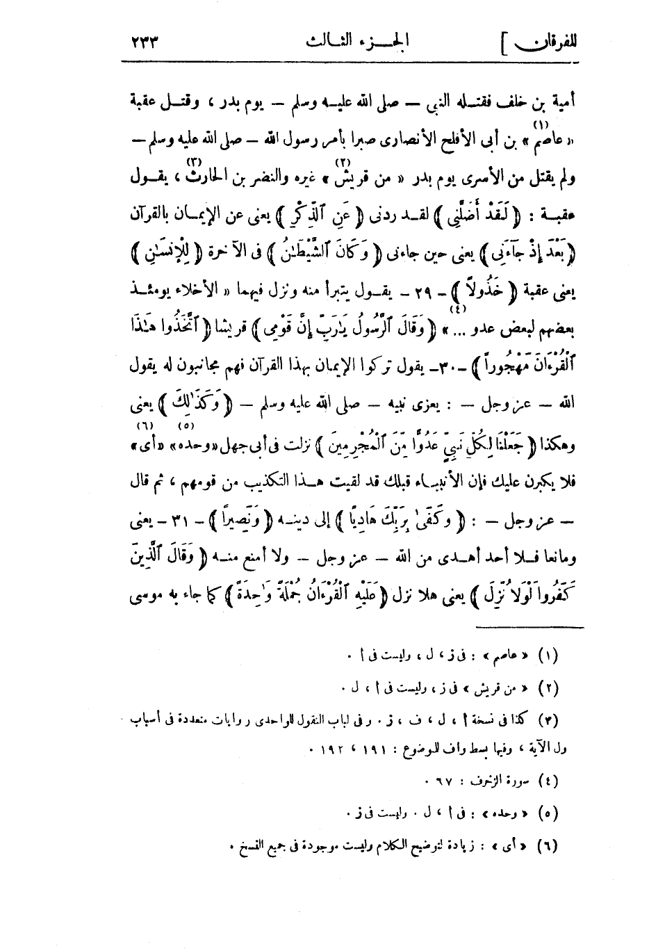 أمية بن خلف فقتله النَّبِيّ- صَلَّى اللَّهُ عَلَيْهِ وَسَلَّمَ- يوم بدر، وقتل عقبة «عاصم» «1» بن أبي الأفلح الأنصاري صبرا بأمر رسول الله- صلى الله عليه وسلم- ولم يقتل من الأسرى يوم بدر «من قريش» «2» غيره والنضر بن الحارث «3» ، يقول عقبة: لَقَدْ أَضَلَّنِي لقد ردني عَنِ الذِّكْرِ يعني عن الإيمان بالقرآن بَعْدَ إِذْ جاءَنِي يعني حين جاءني وَكانَ الشَّيْطانُ في الآخرة لِلْإِنْسانِ يعني عقبة خَذُولًا- 29- يقول يتبرأ منه ونزول فيهما «الْأَخِلَّاءُ يَوْمَئِذٍ بَعْضُهُمْ لِبَعْضٍ عَدُوٌّ ... » «4» وَقالَ الرَّسُولُ يا رَبِّ إِنَّ قَوْمِي قريشا اتَّخَذُوا هذَا الْقُرْآنَ مَهْجُوراً- 30- يقول تركوا الإيمان بهذا القرآن فهم مجانبون له يقول الله- عز وجل-: يعزي نبيه- صلى الله عليه وسلم- وَكَذلِكَ يعني وهكذا جَعَلْنا لِكُلِّ نَبِيٍّ عَدُوًّا مِنَ الْمُجْرِمِينَ نزلت في أبي جهل «وحده» «5» «أي» «6» فلا يكبرن عليك فإن الأنبياء قبلك قد لقيت هذا التكذيب من قومهم، ثم قال- عز وجل-: وَكَفى بِرَبِّكَ هادِياً إلى دينه وَنَصِيراً- 31- يعني ومانعا فلا أحد أهدى من الله- عز وجل- ولا أمنع منه وَقالَ الَّذِينَ كَفَرُوا لَوْلا نُزِّلَ يعنى هلا نزل عَلَيْهِ الْقُرْآنُ جُمْلَةً واحِدَةً كما جاء به موسى