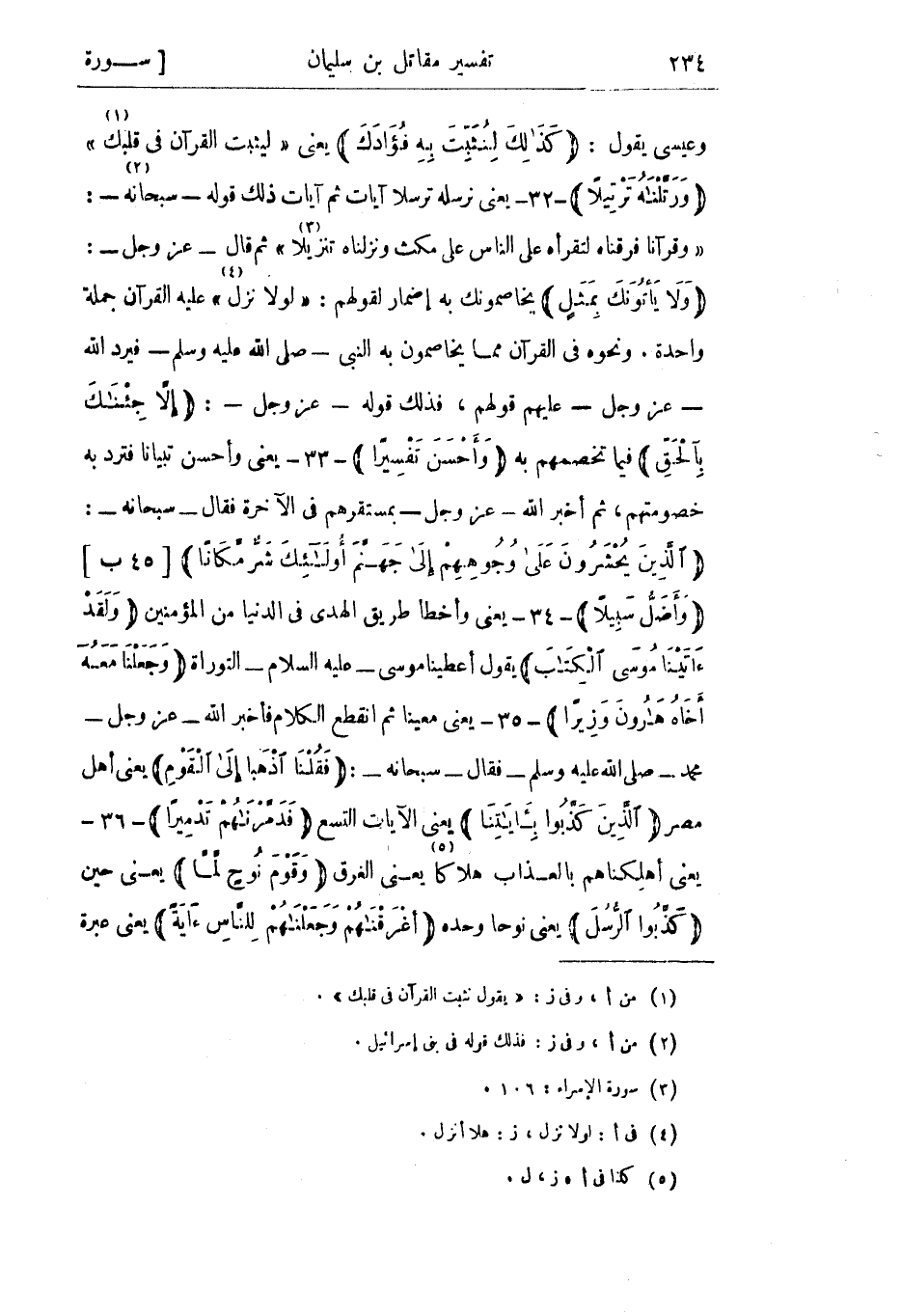 وَلا يَأْتُونَكَ بِمَثَلٍ يخاصمونك به إضمار لقولهم: «لولا نزل» «4» عليه القرآن جملة واحدة، ونحوه في القرآن مما يخاصمون به النبي- صلى الله عليه وسلم- فيرد الله- عز وجل- عليهم قولهم، فذلك قوله- عز وجل-: إِلَّا جِئْناكَ بِالْحَقِّ فيما تخصمهم به وَأَحْسَنَ تَفْسِيراً- 33- يعني وأحسن تبيانا فترد به خصومتهم، ثم أخبر الله- عز وجل- بمستقرهم في الآخرة فقال- سبحانه-: