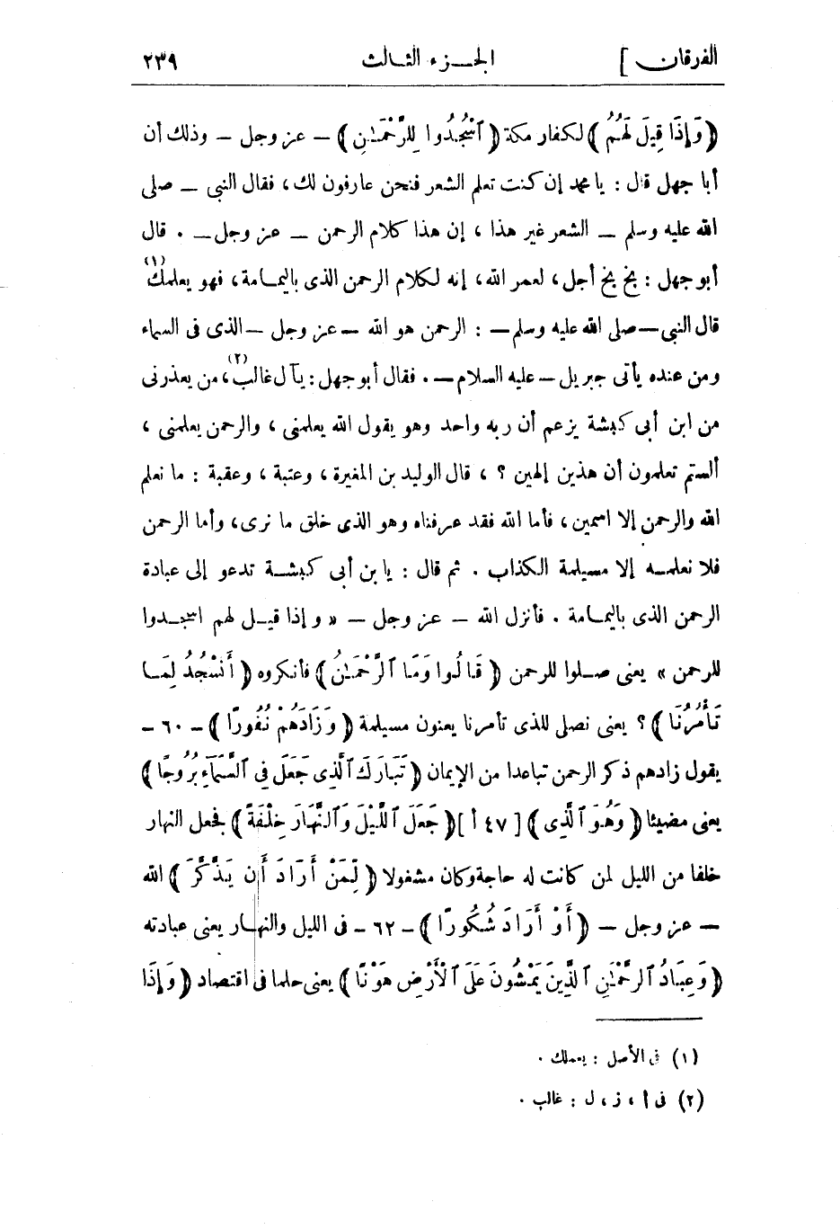 يعنى صلوا للرحمن قالُوا وَمَا الرَّحْمنُ فأنكروه أَنَسْجُدُ لِما تَأْمُرُنا؟ يعني نصلي للذي تأمرنا يعنون مسيلمة وَزادَهُمْ نُفُوراً- 60- يقول زادهم ذكر الرحمن تباعدا من الإيمان تَبارَكَ الَّذِي جَعَلَ فِي السَّماءِ بُرُوجاً يعنى مضيئا وَهُوَ الَّذِي [47 أ] جَعَلَ اللَّيْلَ وَالنَّهارَ خِلْفَةً فجعل النهار خلفا من الليل لمن كانت له حاجة وكان مشغولا لِمَنْ أَرادَ أَنْ يَذَّكَّرَ الله- عز وجل- أَوْ أَرادَ شُكُوراً- 62- في الليل والنهار يعني عبادته وَعِبادُ الرَّحْمنِ الَّذِينَ يَمْشُونَ عَلَى الْأَرْضِ هَوْناً يعني حلما في اقتصاد وَإِذا خاطَبَهُمُ الْجاهِلُونَ