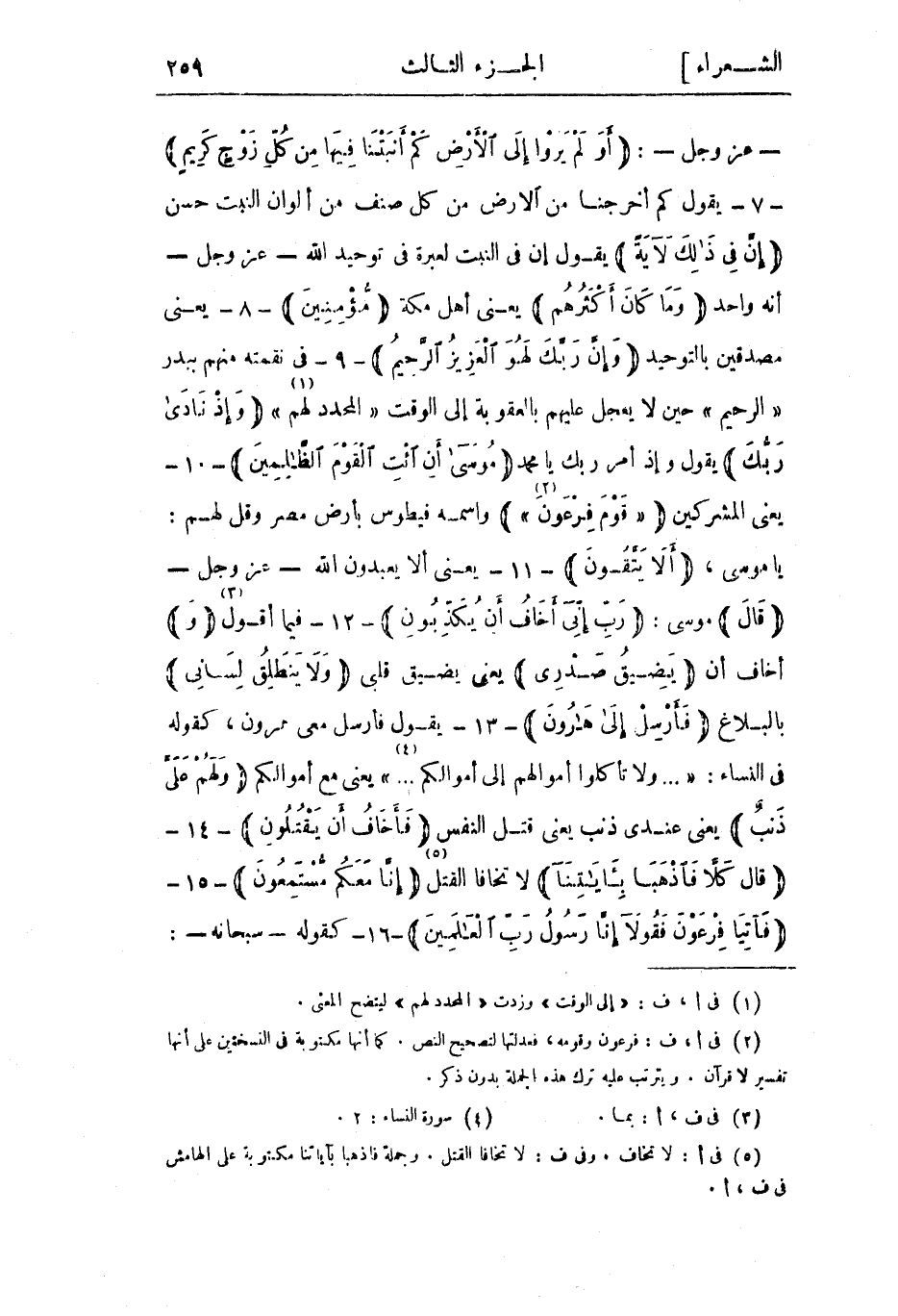 - عز وجل-: أَوَلَمْ يَرَوْا إِلَى الْأَرْضِ كَمْ أَنْبَتْنا فِيها مِنْ كُلِّ زَوْجٍ كَرِيمٍ- 7- يقول كم أخرجنا من الأرض من كل صنف من ألوان النبت حسن إِنَّ فِي ذلِكَ لَآيَةً يقول إن في النبت لعبرة في توحيد الله- عز وجل- أنه واحد وَما كانَ أَكْثَرُهُمْ يعني أهل مكة مُؤْمِنِينَ- 8- يعني مصدقين بالتوحيد وَإِنَّ رَبَّكَ لَهُوَ الْعَزِيزُ الرَّحِيمُ- 9- في نقمته منهم ببدر «الرَّحِيمُ» حين لا يعجل عليهم بالعقوبة إلى الوقت «المحدد لهم «1» » وَإِذْ نادى رَبُّكَ يقول وإذ أمر ربك يا محمد مُوسى أَنِ ائْتِ الْقَوْمَ الظَّالِمِينَ- 10- يعني المشركين «قَوْمَ فِرْعَوْنَ» «2» واسمه فيطوس بأرض مصر وقل لهم: