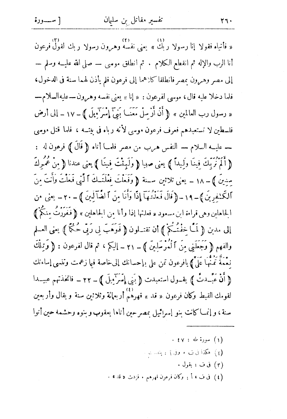 «فَأْتِياهُ فَقُولا إِنَّا رَسُولا رَبِّكَ «1» » يعنى نفسه «2» وهرون رسولا ربك لقول «3» فرعون أنا الرب والإله ثم انقطع الكلام. ثم انطلق موسى- صلى الله عليه وسلم- إلى مصر وهرون بمصر فانطلقا كلاهما إلى فرعون فلم يأذن لهما سنة في الدخول، فلما دخلا عليه قال، موسى لفرعون: «إنا» يعنى نفسه وهرون- عليه السلام- «رَسُولُ رَبِّ الْعَالَمِينَ» أَنْ أَرْسِلْ مَعَنا بَنِي إِسْرائِيلَ- 17- إلى أرض فلسطين لا تستعبدهم فعرف فرعون موسى لأنه رباه في بيته، فلما قتل موسى- عليه السلام- النفس هرب من مصر فلما أتاه قالَ فرعون له: